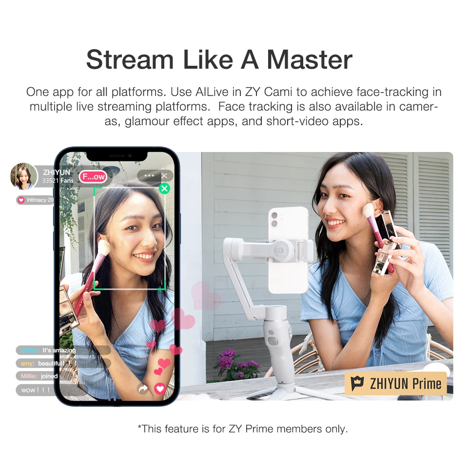 Одно приложение для всех платформ. Используйте AILive in ZY Cami для отслеживания лиц на нескольких потоковых платформах. Отслеживание лиц также доступно в камерах, приложениях с эффектом гламура и коротких видеоприложениях.* Эта функция предназначена только для членов ZY Prime.
