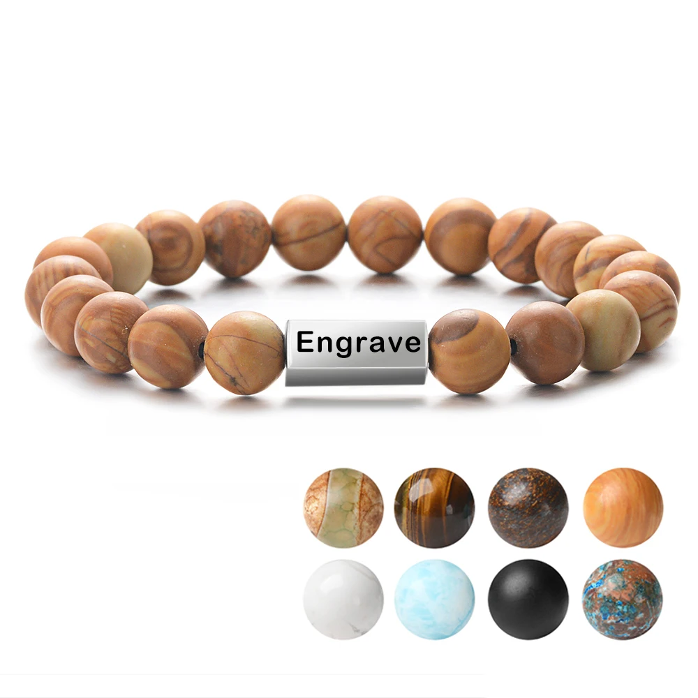 Браслет из натурального камня для мужчин и женщин, браслет из нержавеющей стали с индивидуальной гравировкой имени для друзей и семьи, любимых ювелирных изделий
