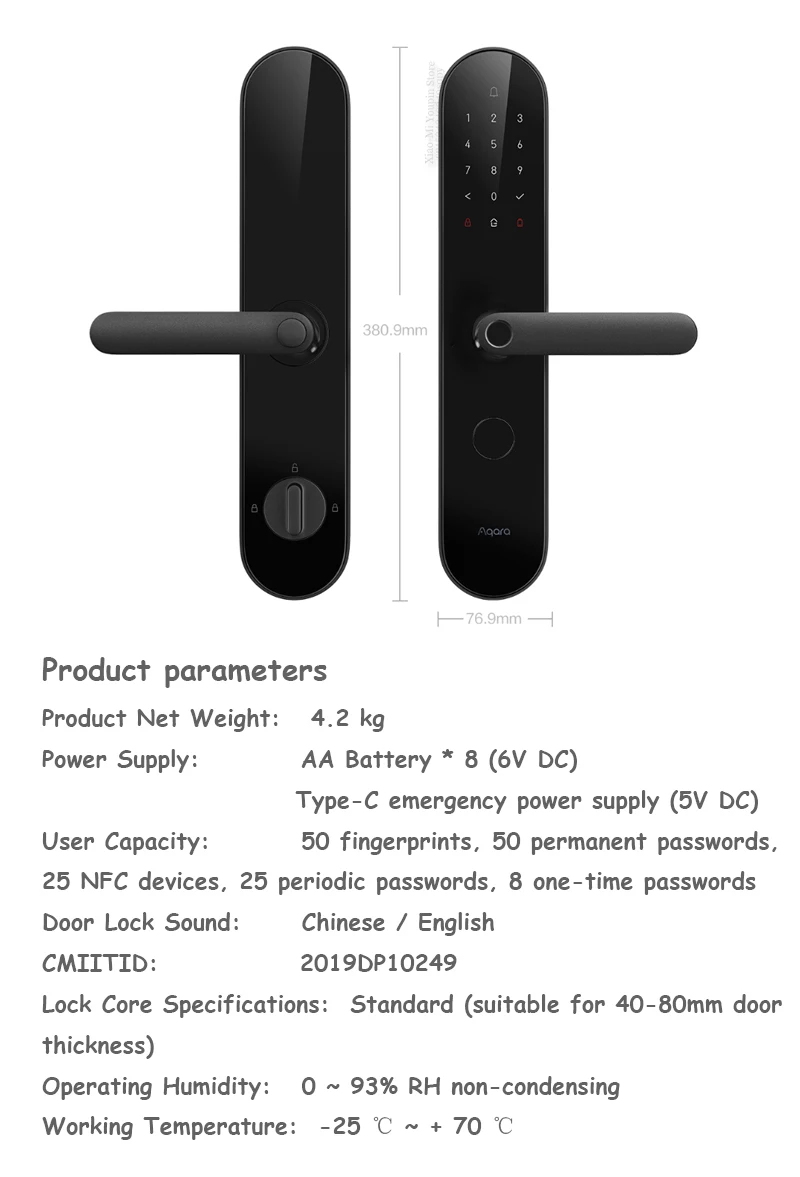 -Семь способов разблокировки: отпечаток пальца, пароль, ключ, временный пароль, bluetooth, NFC (поддерживается только Xiaomi phone, Mi band 4, последние часы), homekit blutooth.