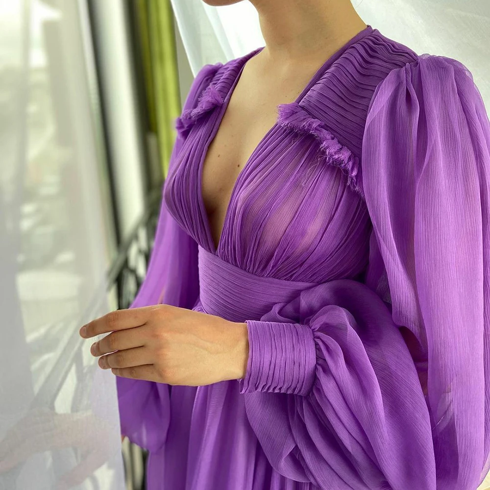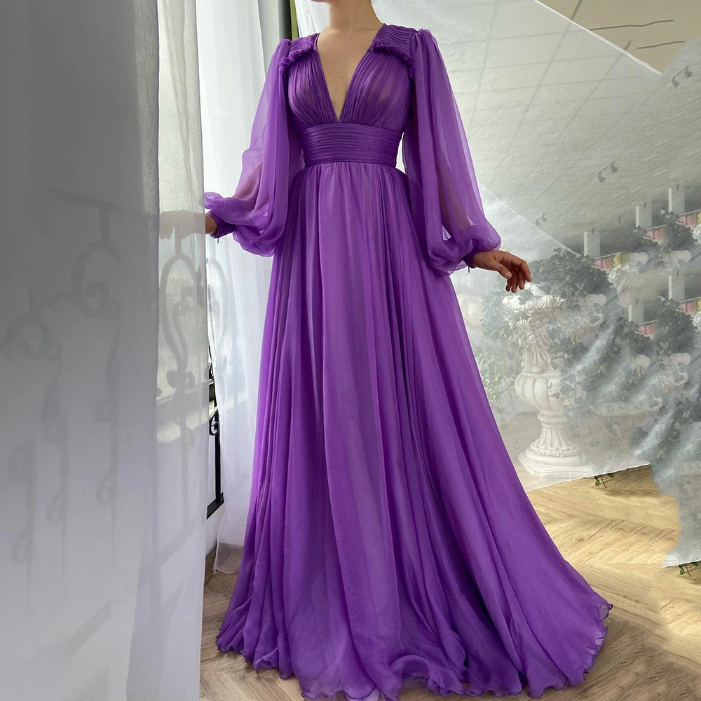 UZN фиолетовое ТРАПЕЦИЕВИДНОЕ длинное платье для выпускного вечера, сексуальное платье с v-образным вырезом и длинными пышными рукавами, вечерние платья со складками, вечерние платья