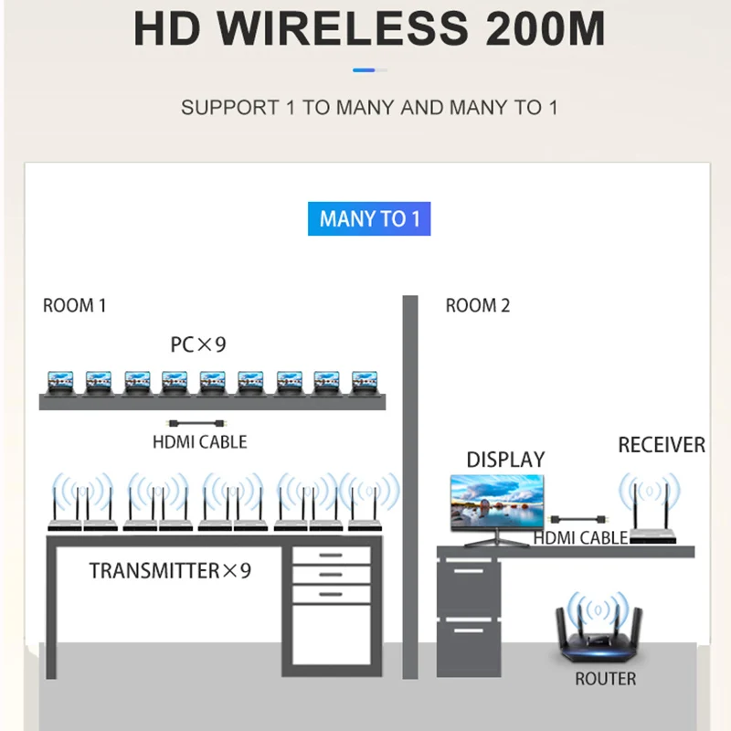 Беспроводной удлинитель HDMI 2,4G 5G, KVM-удлинитель до 200 м, беспроводной передатчик HDMI с поддержкой 4 приемников