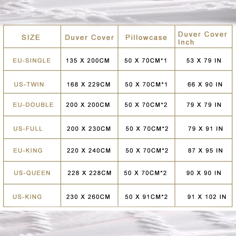 США-Полный:Пододеяльник (1 шт.): 200x230 см = 79x91in наволочка (2 шт.): 50x75 см = 20x30in