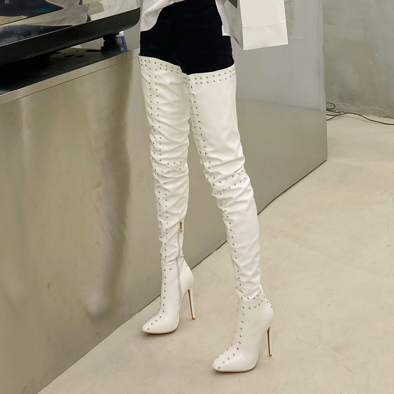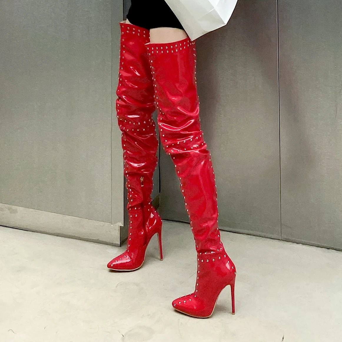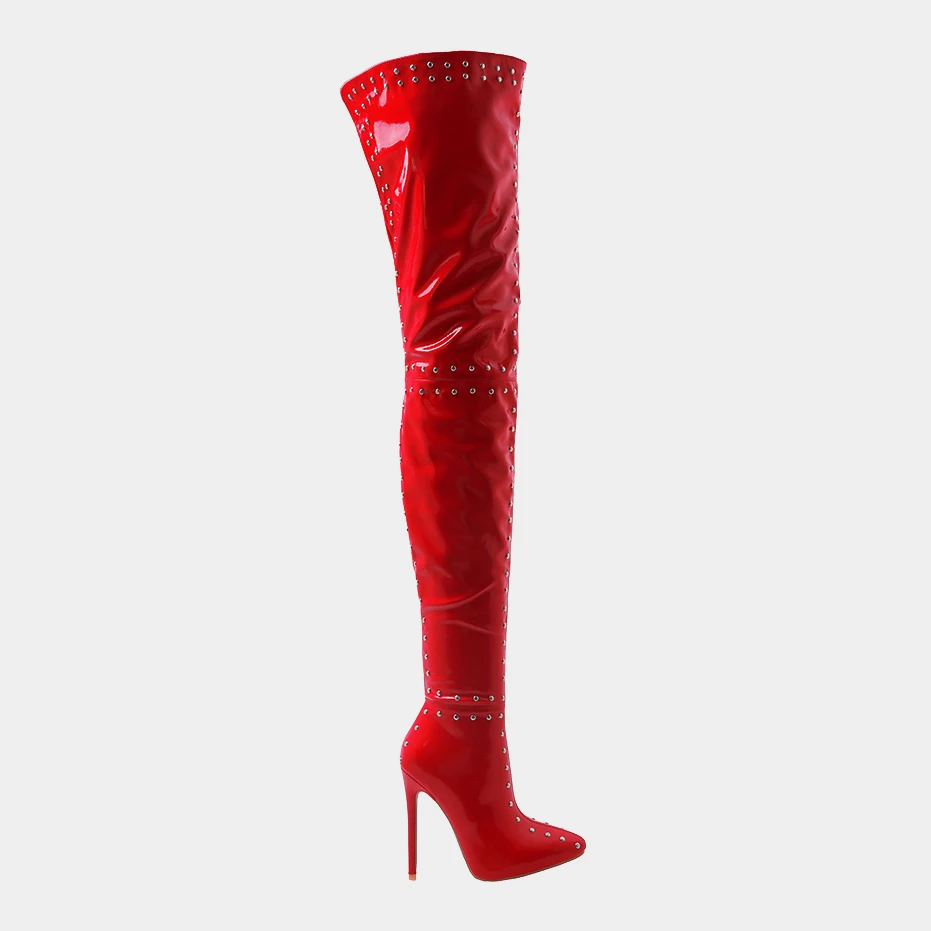 Женские сапоги выше колена, красные, белые лакированные сапоги до б...