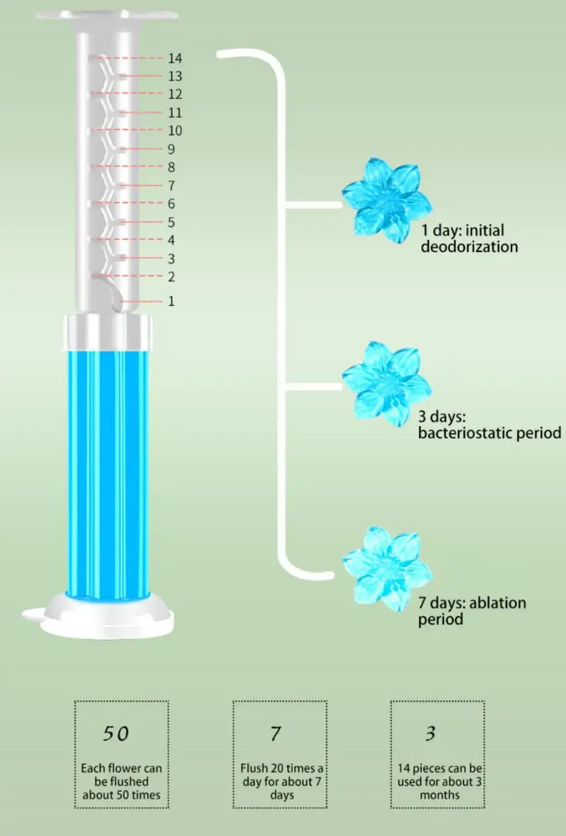 Частота использования: маленький цветок используется для 7 дней, а туалетный гель используется для 14 маленьких цветов, который используется для 3 месяцев