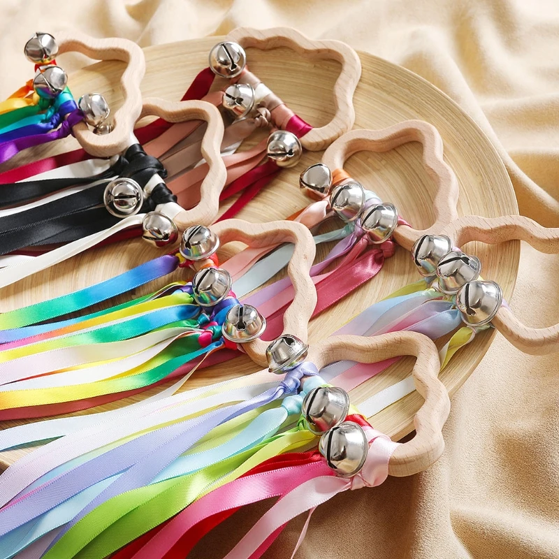 Деревянная погремушка Монтессори с радужной лентой, ручной воздушны...