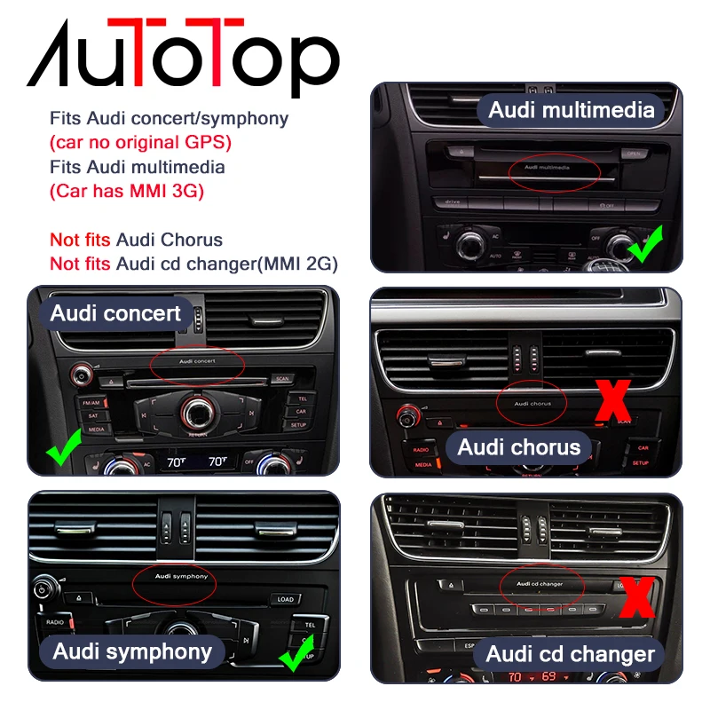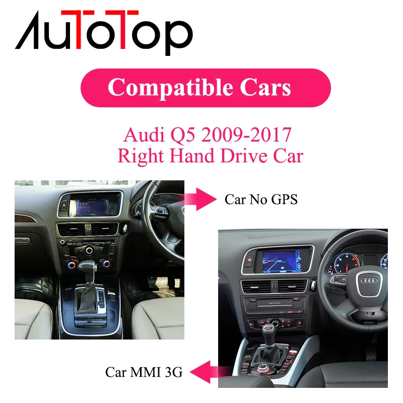 Audi Q5 2009-2016 только для правого автомобиляАвтомобиль должен иметь функцию AUX или AMIAudi Concernt / Sypphony / Audi мультимедиаНе подходит для Audi Chrous Radio и Audi CD Changer