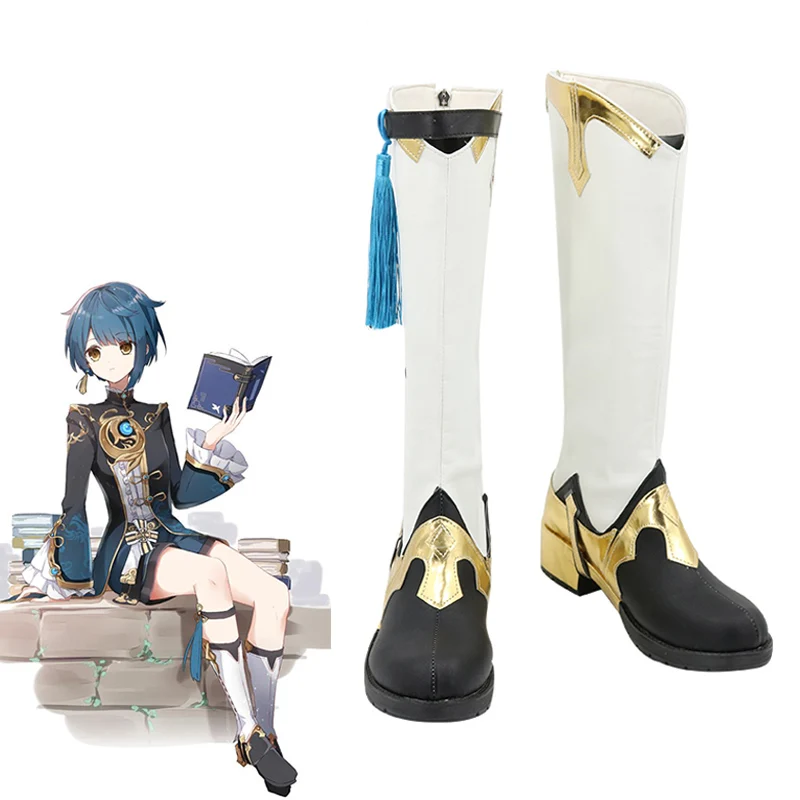 Обувь Genshin Impact Xingqiu для косплея, белые маскарадные сапоги, Подвесные серьги, парики, аксессуары для костюма на Хэллоуин