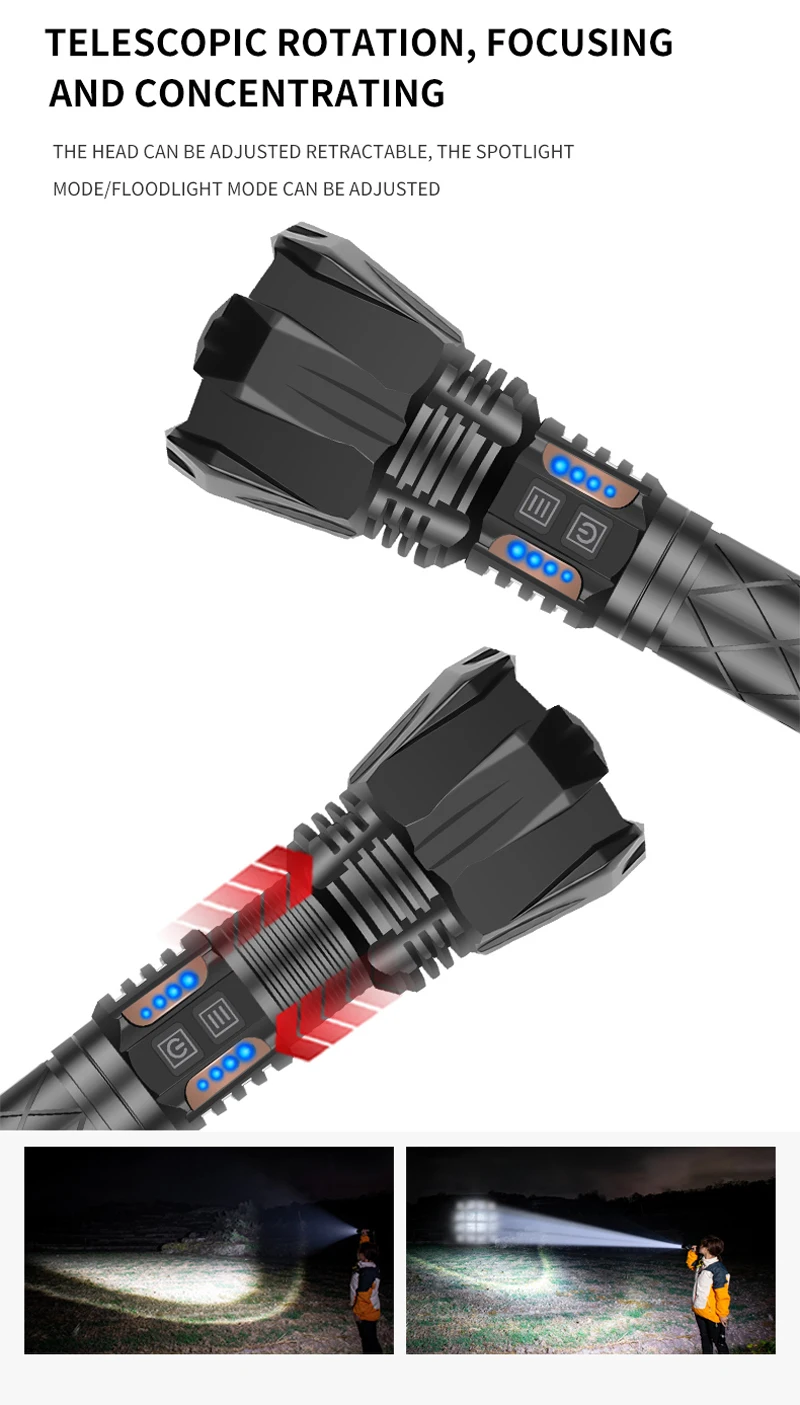 Вход и выход, дисплей питания1. Выпуклая линза: выпуклая линза Орлиного глаза, хорошая светопередача, не легко повредить, сильная алюминиевая ударная головка для защиты объектива от износа2. Телескопический зум: растянуть голову влево и вправо, чтобы увеличить, астигматизм-режим концентрации, удобно использовать в различных ситуациях;3. Средний переключатель: высококачественный натуральный резиновый материал, нескользящая обработка поверхности, легкий сенсорный переключатель для переключения режима освещения;4. Контакт батареи: контактная конструкция батареи имеет хорошую электропроводность и эффективно предотвращает плохой контакт.