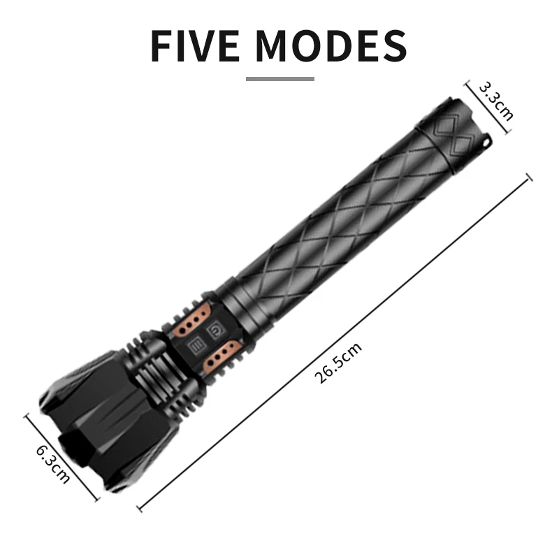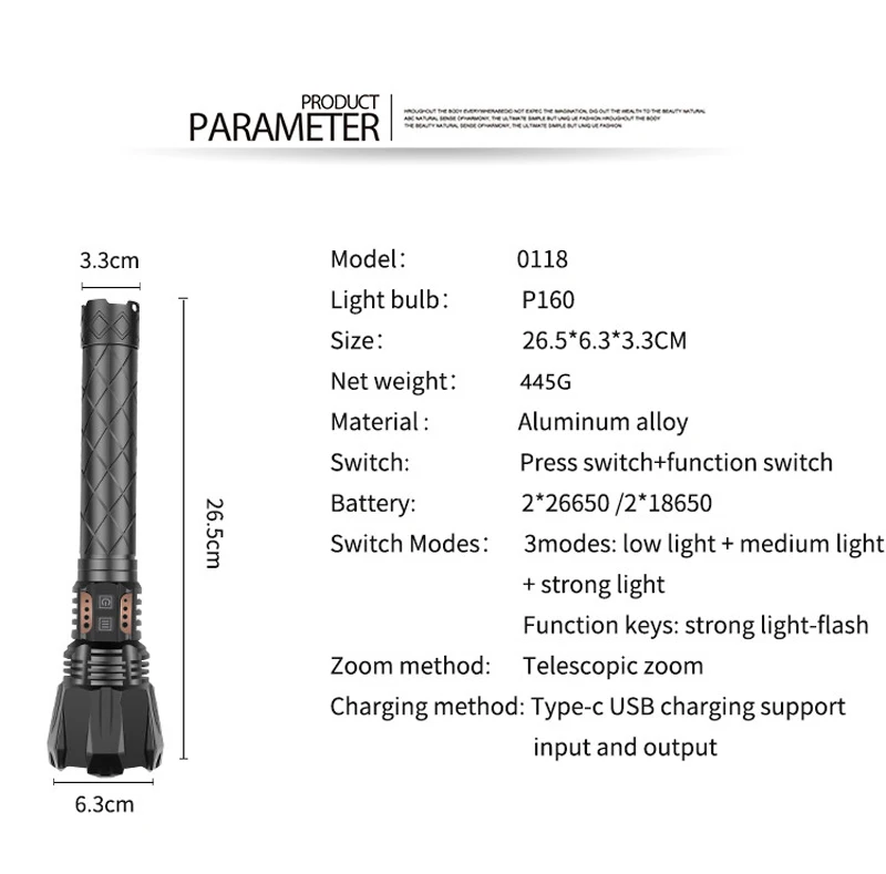 Модель лампы: XHP160Материал линз: оптические линзыРабочая передача: 3 передачи (сильный, средний, слабый)Функциональная клавиша: сильный свет-вспышкаРазмер продукта: 265x63x33mmПрименимые Аккумуляторы: 26650x 2/18650x2 (тип верхнего наконечника)Класс водонепроницаемости: IPX4Мощность продукта: 35 ВтМатериал изделия: алюминиевый сплавРабочее напряжение: 3,7 вЦвет изделия: черныйПрямая зарядка: TYPE-C Прямая зарядка USB (с выходным и входным двойным интерфейсом)Цифровой зум: Телескопический фокусПоложение переключателя: Средний кнопочный переключатель + функциональный переключательДисплей питания: 4 светодиодных индикатора, каждый свет представляет 25% мощностиВес нетто продукта: 540 г (один фонарик)