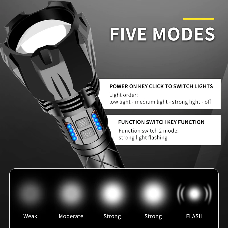 Средний кнопочный переключатель: сильный-низкий-средний-сильный;Функциональный переключатель: сильный свет-вспышка