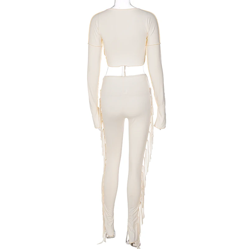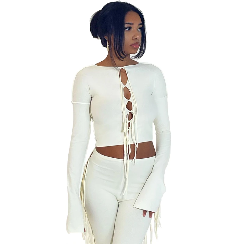 Hugcitar Однотонный женский короткий топ с длинными расклешенными рукавами и завязками, леггинсы, комплект из 2 предметов, осень 2021, Y2K, уличная одежда, модная одежда