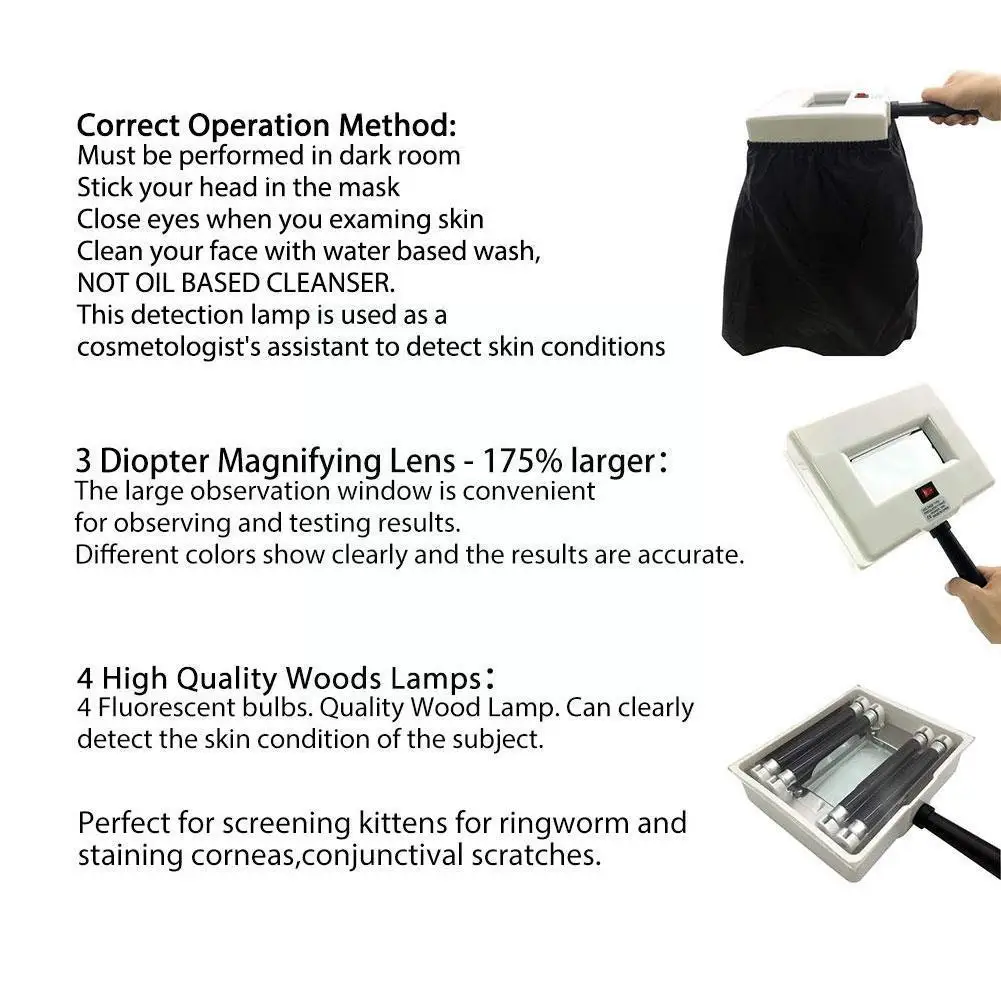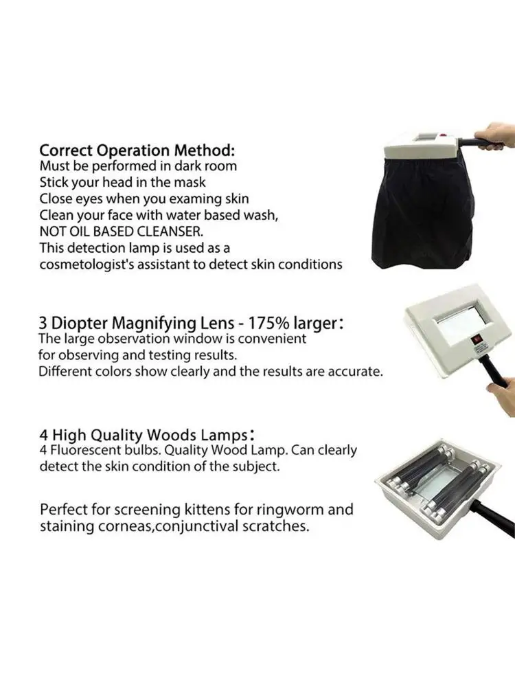 Эта профессиональная лампа для ухода за кожей имеет увеличительное стекло 3х диоптрий и использует УФ-светильник для диагностики состояния кожи. Это диагностический инструмент, используемый в дерматологии для наблюдения за любым последующим флюорессом кожи. Длина волны прибл. 365 нанометров.Деревянная лампа помогает четко определить качества, проблемы и необычные условия кожи, чтобы обеспечить правильное лечение, изучить различные виды кожи, типы или частицы кожи и условия, обнаруживает дефекты кожи, которые обычно невидимы для глаз. Позволяет эстетику проводить план лечения для правильного лица.4 флуоресцентных лампы, линзы nifier и 1 лицевая драпировка для осмотра.Название: анализатор кожи лампыТок лампы: 0,16 мАНапряжение лампы: 32-36 вДлина волны: 365нмИнтенсивность УФ: больше или равна 1000 мВт/см23000 часов работыМощность: 16 ВтОбъектив: 3 дня или 5 днейФункция: омоложение кожиСтандартное напряжение: 110-220 ВИсточник питания: электрическийДлина волны прибл. 365 нанометровФункция: показывает дефекты кожи, такие как сухостьХарактеристики цветовСиний светильник: нормальная здоровая кожаКоричневый флуоресцентный: пигментация и темные пятнаОранжевые точки: жирная кожаФиолетовый и темно-фиолетовый: мягкая кожа, обезвоженная кожа, кожа не пропускает влагуБелый флуоресцентный: толстый слой кожи и клеток DeakСветильник желтый: жирная акне Технические параметрыИсточник питания: 100-120 В/60 Гц 220-240 В/50 ГцНоминальная входная мощность: 54 ВтДлина волны прибл. 365 нанометров Операции с деревянной лампой1. После очищения кожи закройте глаза клиента хлопком.2. Надежная крышка для деревянной лампы.3. Полностью покрывает лицо клиента с чехлом. Деревянная лампа должна быть параллельна клиенту с расстоянием 15-20 см.4. Определение различных характеристик кожи по внешнему виду различных цветов под ультрафиолетовым лучом. Посылка включает в себя1 x тестер кожи1x капюшон