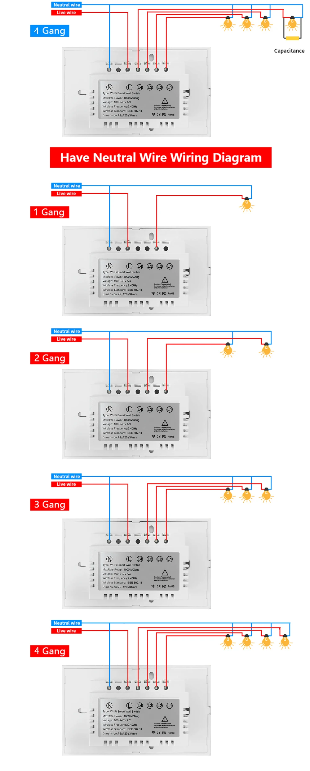 Характеристики1/2/3/4 Gang WiFi Touch Switch