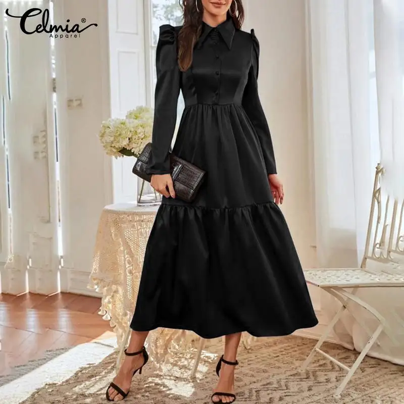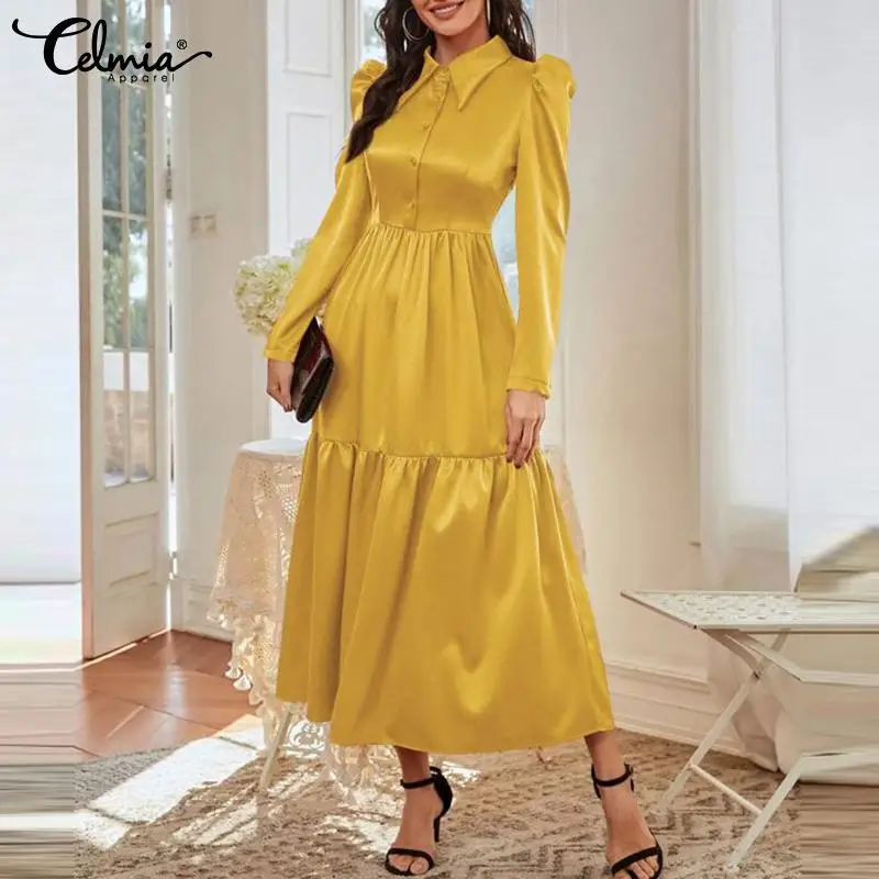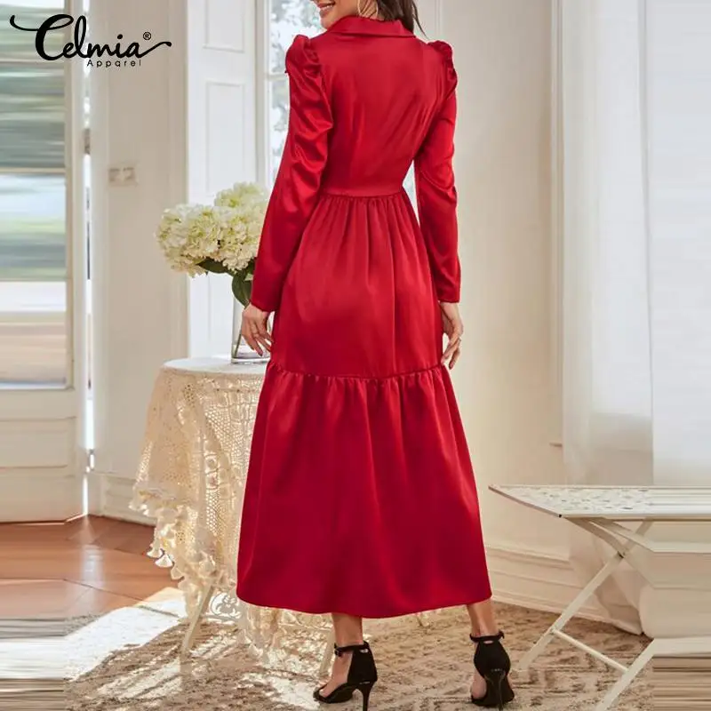 Celmia 2022 осеннее атласное длинное платье-рубашка, женское элегантное Макси-платье, Повседневное платье с отворотом и длинным рукавом, праздничное однотонное вечернее платье