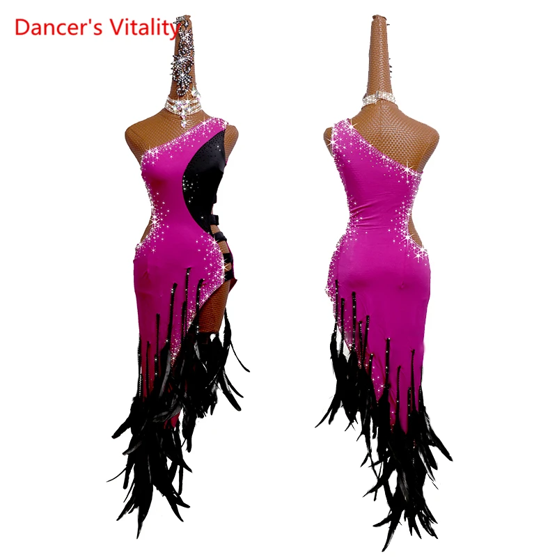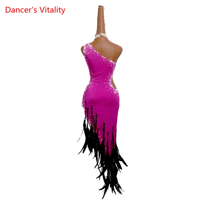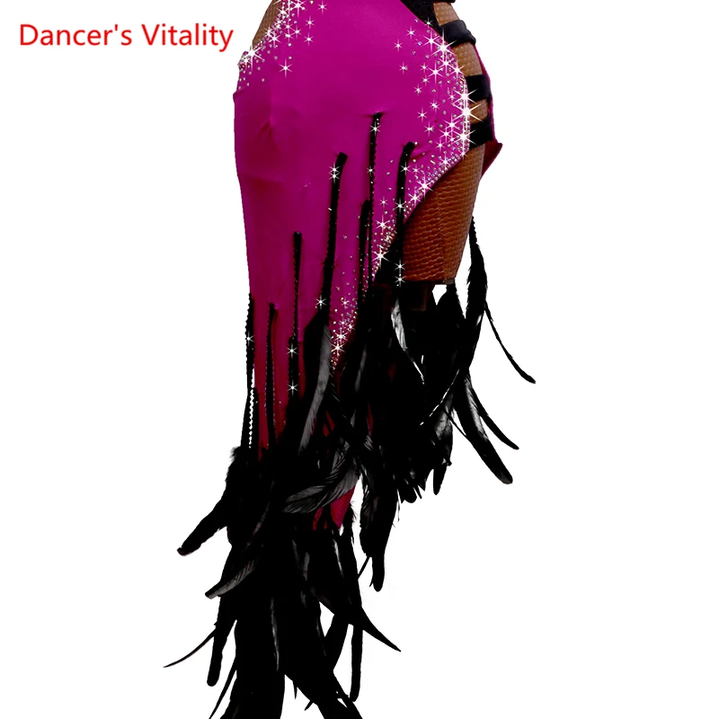 Платье для латиноамериканских танцев, для взрослых и девочек, с перьями и косым плечом, индивидуальная юбка для танцев, одежда для профессиональных соревнований и представлений