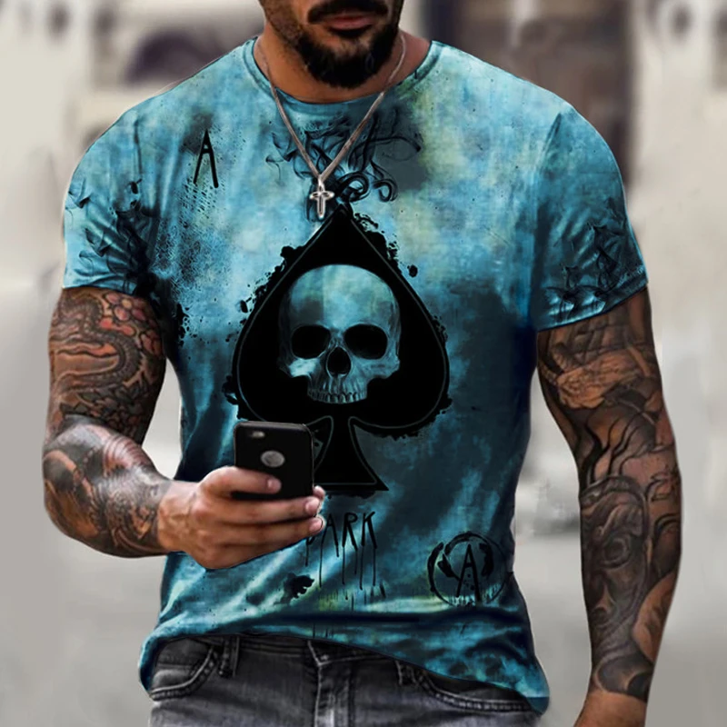 Футболка мужская оверсайз с принтом покера и черепа, Повседневная рубашка с короткими рукавами, уличная одежда в ретро стиле, лето