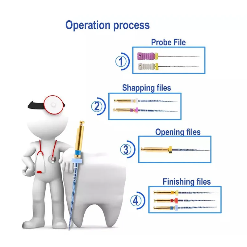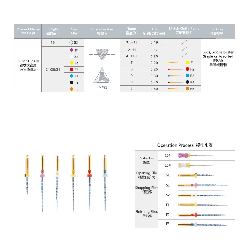 Зубные синие файлы активации тепла Двигателя использовать стоматологические файлы1. Технология термообработки на сантиметровой проволоке2. Руководство по безопасности, уменьшает возможность отклонения корневого канала3. Умный разнообразный Конический дизайн4. Поперечное сечение: треугольник5. Изготовлен из высококачественного сплава NITI, после термической активации становится синий цвет6. Синие файлы гибкие и жесткие, предварительно изогнутые, подходят для сгибания изогнутых корневых каналов7. Более острые и лучшие показатели для канала8. 6 шт. в упаковке, доступны для подготовки одного или разных размеровДоступные размерыОдин размер: SX,S1,S2,F1,F2,F3,F4,F5Разные размеры: Sx-F3Длина: 19 мм, 21 мм, 25 мм, 31 мм