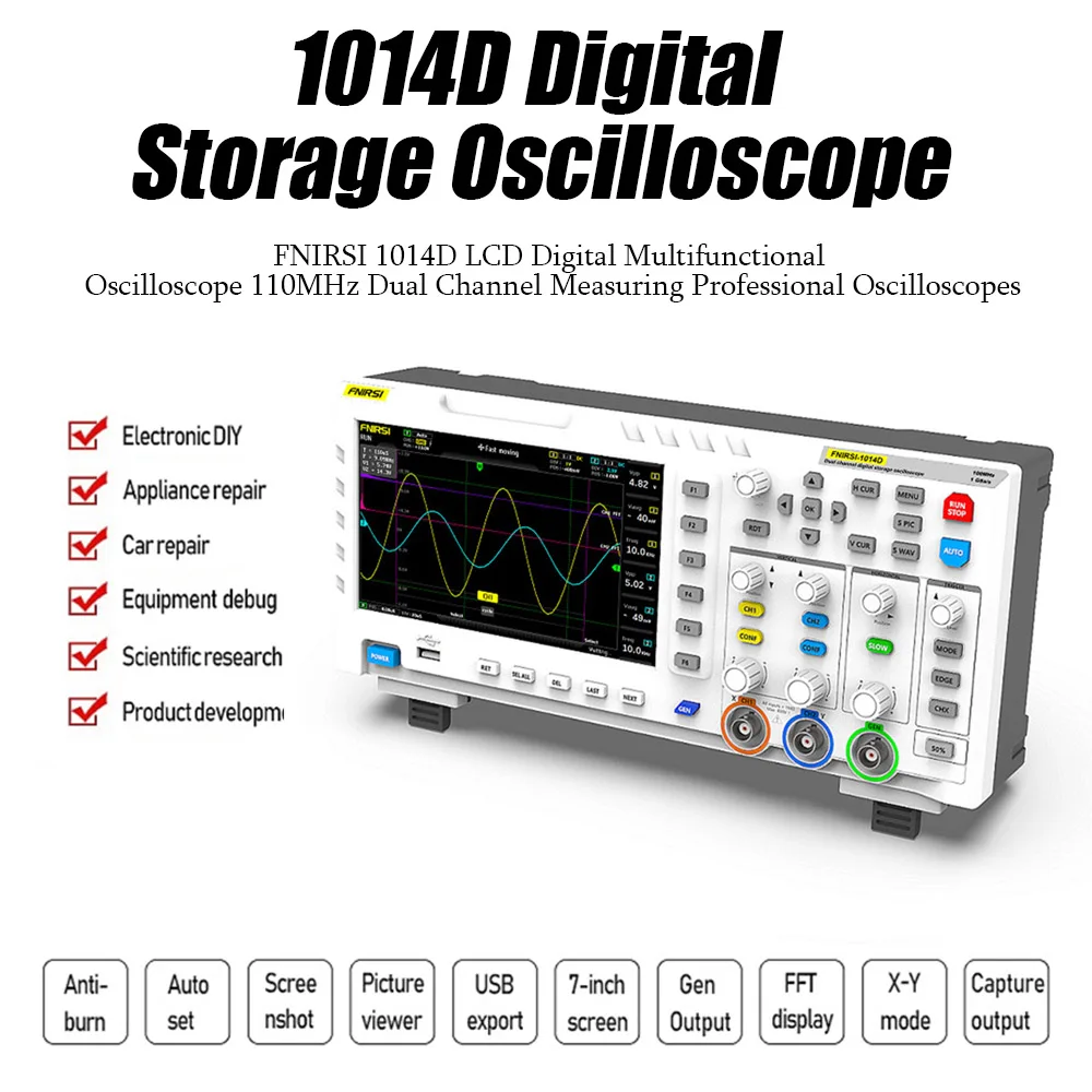Цифровой осциллограф FNIRSI 1014D, Многофункциональный ЖК-дисплей, 110 МГц, двухканальный генератор входных сигналов, Измерение частоты дискретизации 1 Гвыбс
