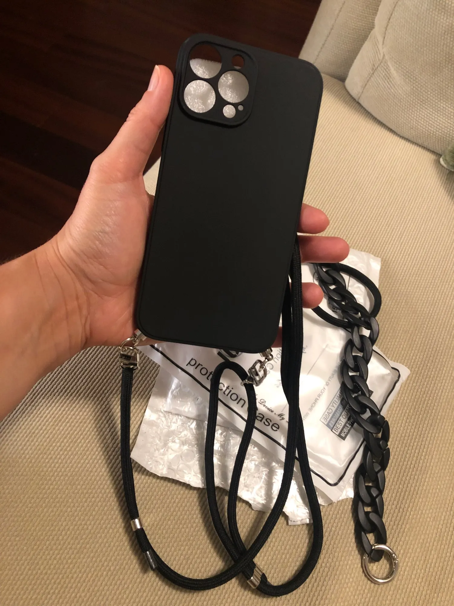 La funda es preciosa. es muy funcional ya que lo puedes llevarlo colgado o con el asa de eslavones en la mano. Hay un detalle que no me acaba de convencer y es que lleva unos pequeñas fijaciones internas que pueden llegar a dañar o arañar el móvil. Pese a que creo que es muy bonito y funcional me pensaré si utilizarlo o no por ese motivo. El vendedor lo entregó muy rápido. Vendedor recomendable.