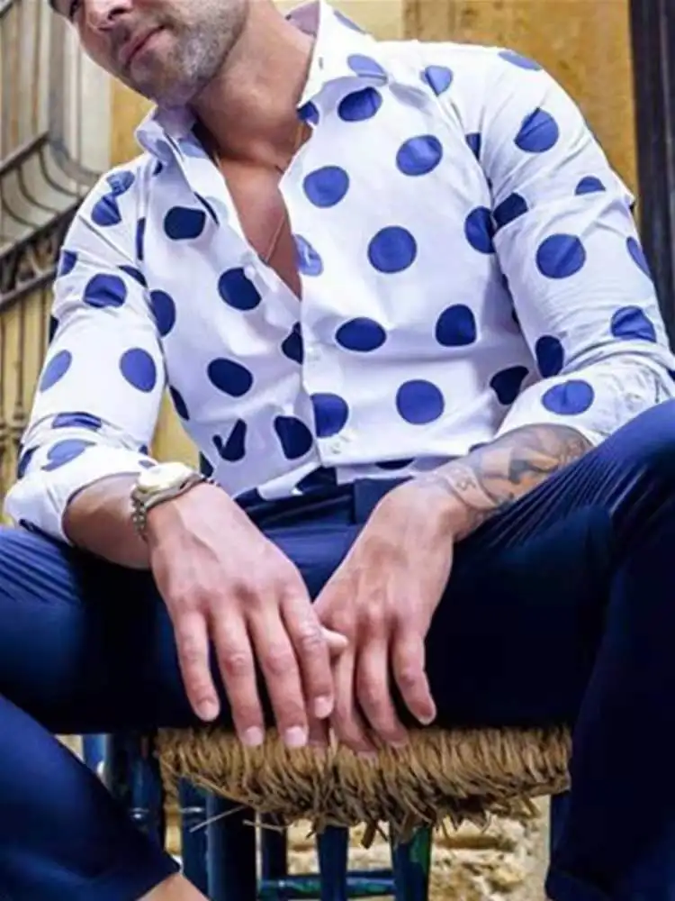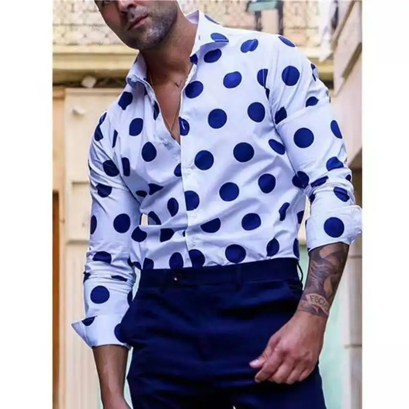 Рубашка мужская с длинным рукавом, модная блузка с принтом в гороше...