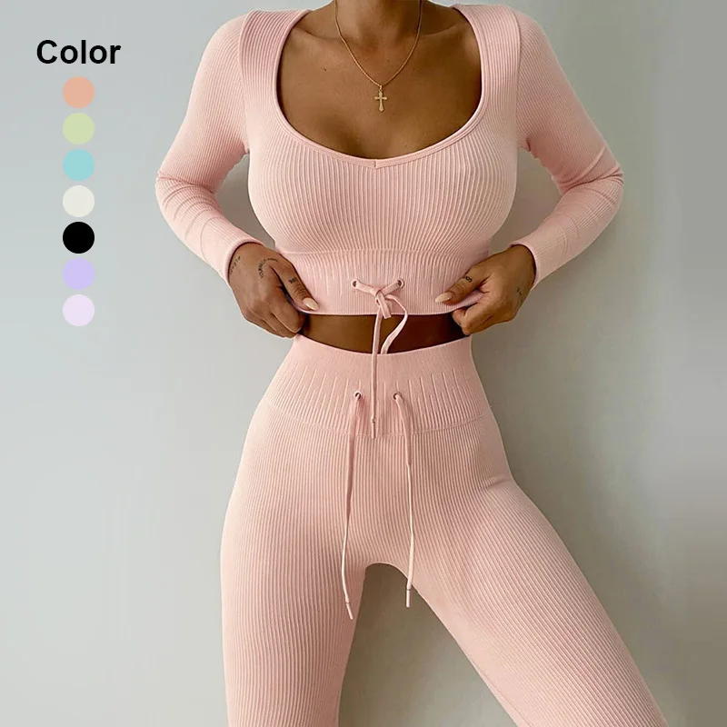 Комплект из 2 предметов для фитнеса, йоги, набор для женщин, короткий топ с длинным рукавом, Бесшовные ребристые леггинсы с высокой талией, тренировочная одежда, спортивный костюм