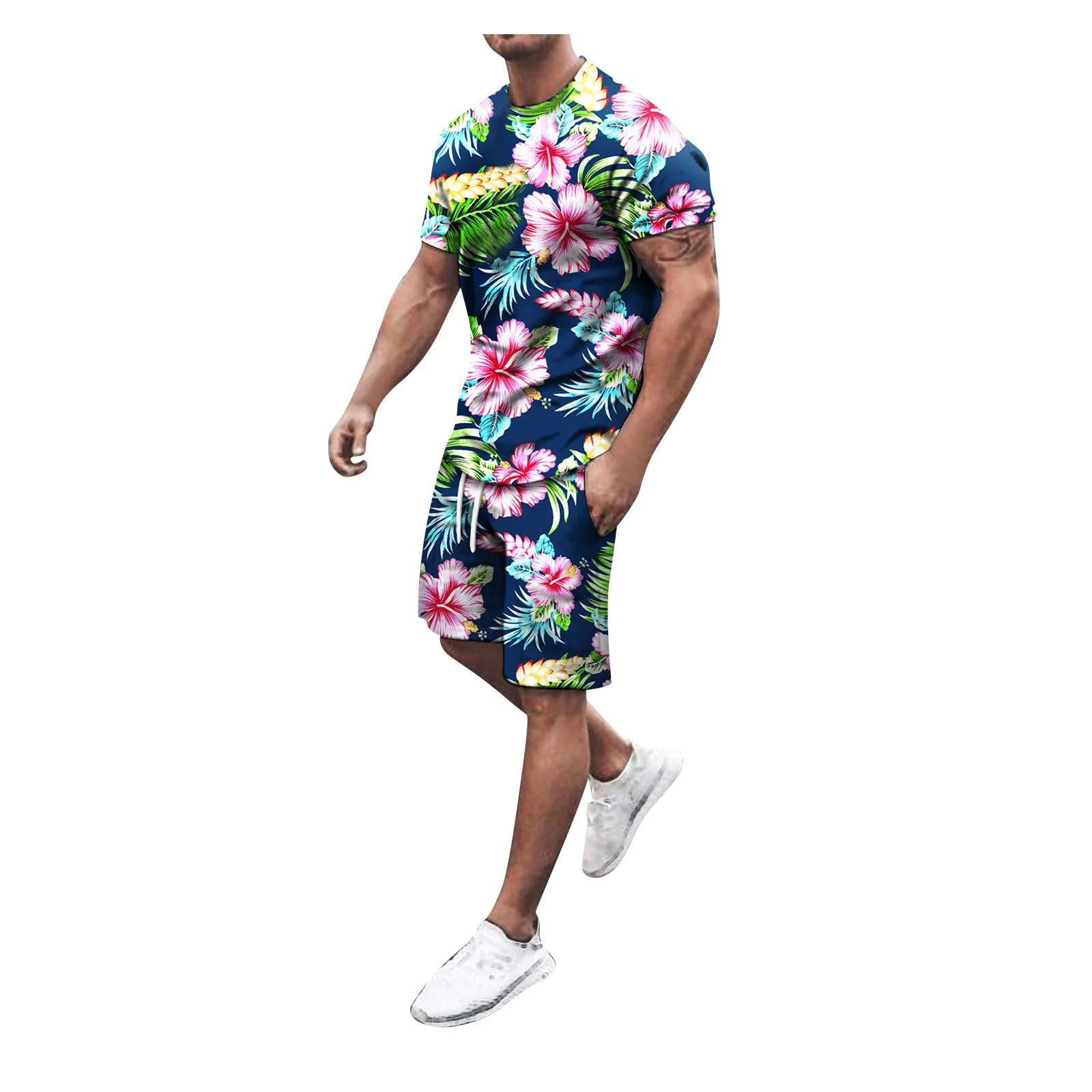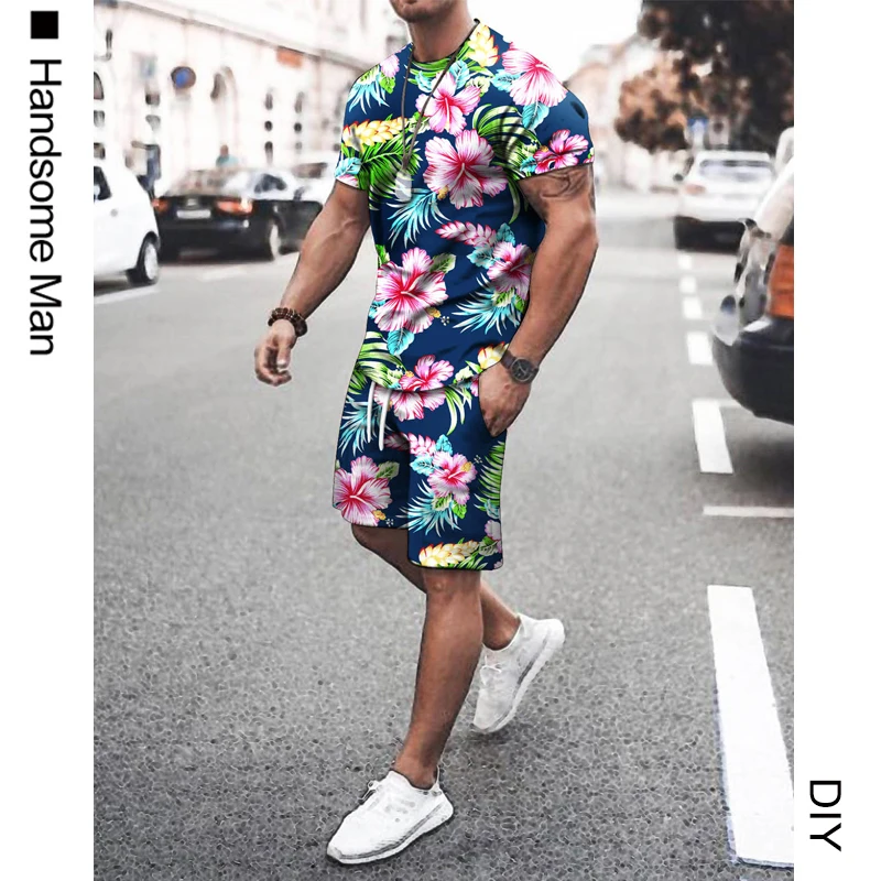 Мужской комплект из 2 предметов, хлопковая футболка с коротким рукавом и цветочным принтом, приталенные повседневные шорты в тропическом стиле, лето 2021