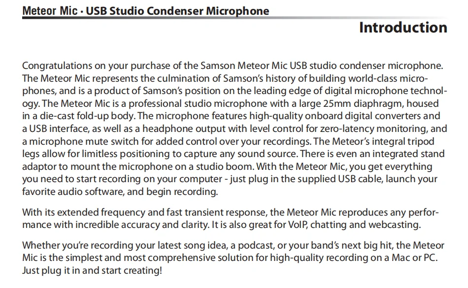 Samson Meteor Mic-это универсальное решение для записи музыки на вашем компьютере. Идеально подходит для вашей домашней студии, также идеально подходит для Skype, iChat или программного обеспечения распознавания голоса. С Samson Meteor Mic вы можете сделать невероятные записи, если вам нравится.