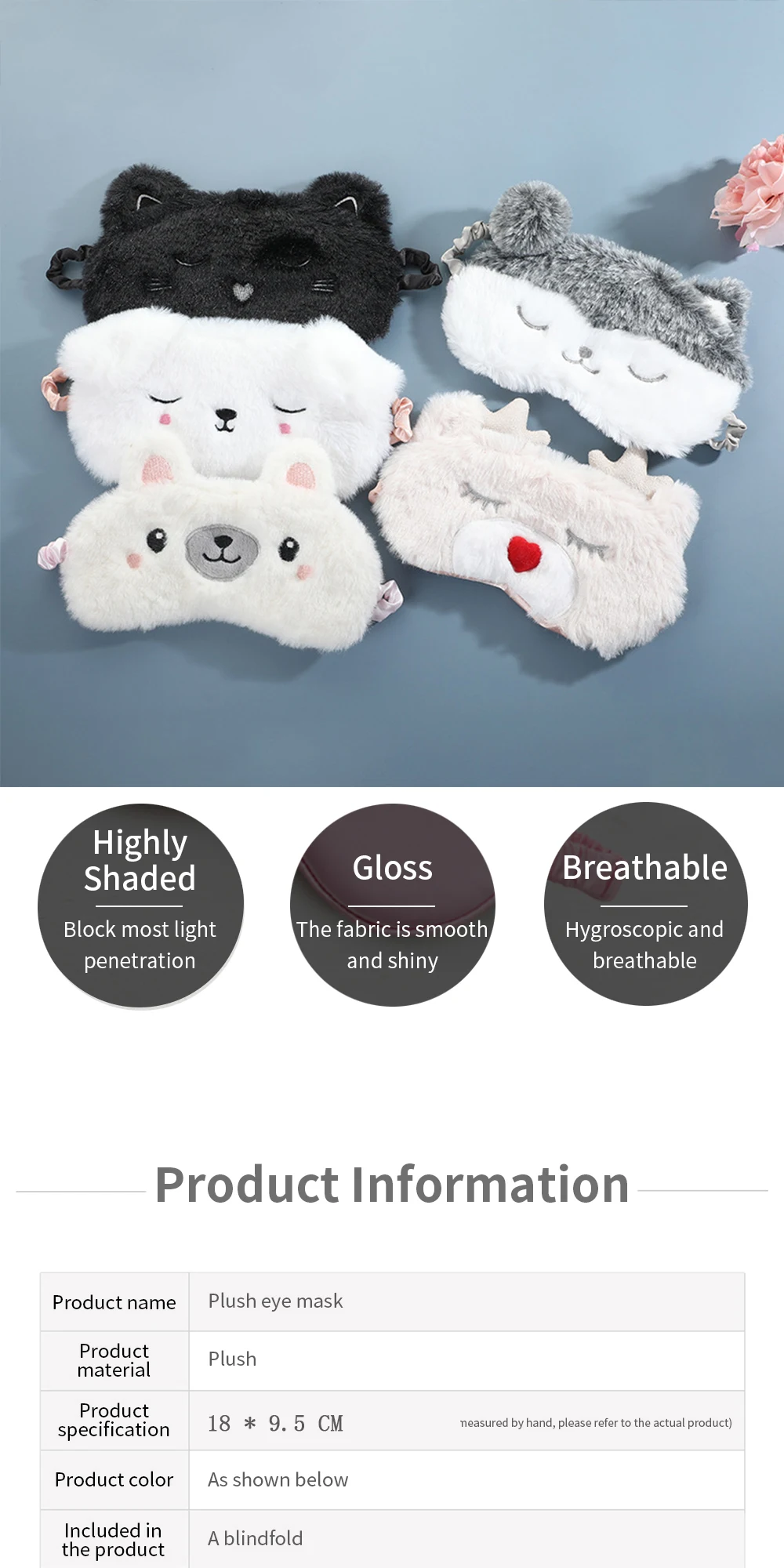 Описание товара:1. Название: плюшевая маска для глаз с животными2. Материал: внешняя Высококачественная плюшевая ткань, внутренний мягкий Шелковый хлопок.3. Виды: плюшевая маска для сна4. Размеры: маска для глаз: 18*9,5 см5. Цвет: различные цвета, такие как розовый, синий, серый и так далее6. Подходит: для мужчин и женщин. Для детейОсобенности1. Качественный плюш снаружи, внутренний слой с использованием хлопкового материала. Мягкие и удобные.2. Эластичный? Ремешок, без давления.3. Он может эффективно сбалансировать давление маски для глаз на лицо владельца, без чувства угнетения, и сделать владельца чувствовать себя комфортно.4. Хороший эффект затенения, наша маска для сна может полностью покрыть ваши глаза, а набивная ткань на мостике носа может блокировать светильник, чтобы убедиться, что вы спите в целом, будь то дома, В отеле или на самолете, хороший аксессуар для путешествий, который поможет вам почувствовать себя отдыхавшим и обновленным.5. Подходит для путешествий, полудня, медитации и работы. Очень удобно.6. Моющиеся и повторно используемые, прочные и экологически чистые.Отзывы:1. Если вы удовлетворены нашим продуктом и обслуживанием, пожалуйста, дайте нам обзор, и мы также будем признательны, если вы могли бы дать нам 5 звезд. 2. Если у вас есть какие-либо вопросы, пожалуйста, не стесняйтесь обращаться к нам. Мы сделаем все возможное, чтобы разрешить вашу проблему.3. Если товар, который вы получили, поврежден или отсутствует, пожалуйста, не оставляйте негативные отзывы, свяжитесь с нами вовремя. Мы решим его как можно скорее и найдем лучшее решение.? 4. Мы гарантируем вам наше самое лучшее обслуживание все время. 5. Если вам нравится наш продукт, не забудьте подписаться на наш магазин, вы можете получить последнюю информацию и купон.Инструкция по уходу:1. Ручная стирка мягко с небольшим мягким шампунем/мылом в прохладной воде.2. Не используйте отбеливатель или смягчитель ткани.3. Не вытирайте и не выкручивайте. Аккуратно выдавите большую часть воды. Сушить на воздухе.4. Чтобы сделать его последним, держите подальше от стиральных машин, горячей воды, прямых солнечных лучей