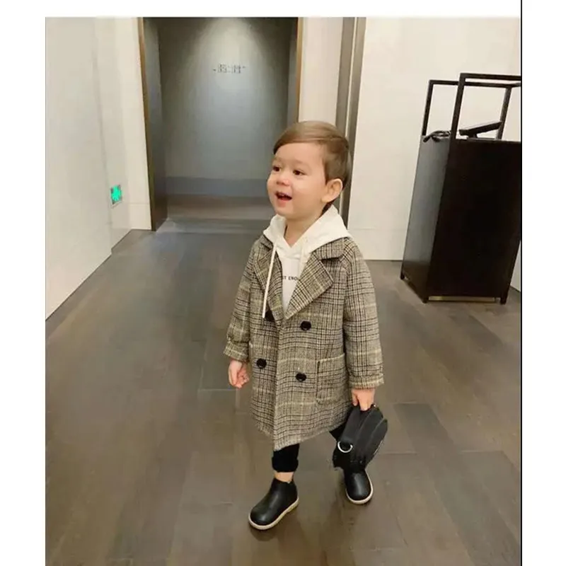 Осенне-зимние клетчатые куртки для мальчиков и девочек, шерстяной двубортный тренчкот для маленьких мальчиков, детская теплая верхняя одежда с лацканами, шерстяное пальто