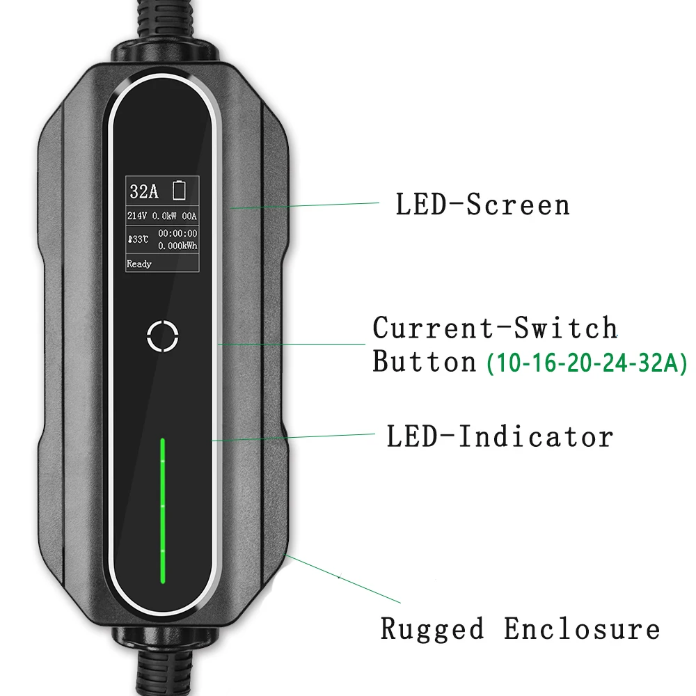 Портативное зарядное устройство для электромобиля, тип 2 с контролируемым цифровым экраном, вилка CEE 32A 16A 24A 20A 10A