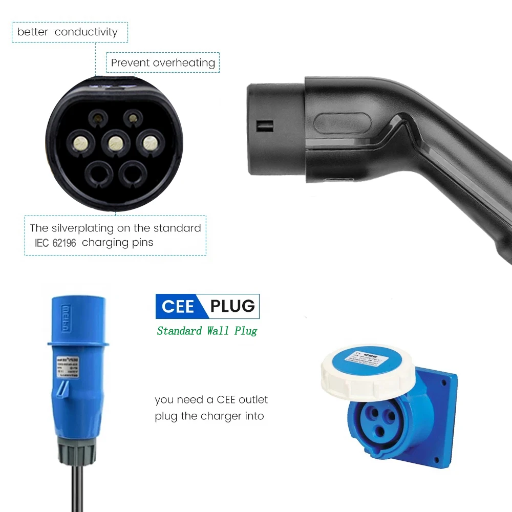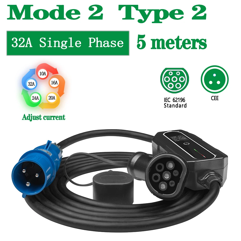 Режим 2 EV зарядное устройство тип 2 с контролируемым цифровым экраном CEE Plug 32A 16A 24A 20A 10A портативное зарядное устройство для электромобиля