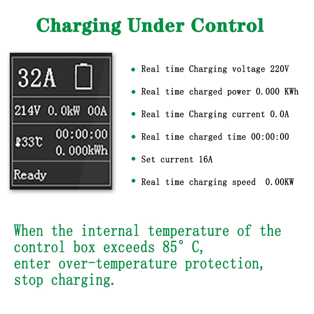 КогдаВнутренняя температура блока управления превышает 85 °C, введитеЗащита от перегрева, остановка зарядки. Он восстановит зарядкуПосле понижения температуры до 65 °C.