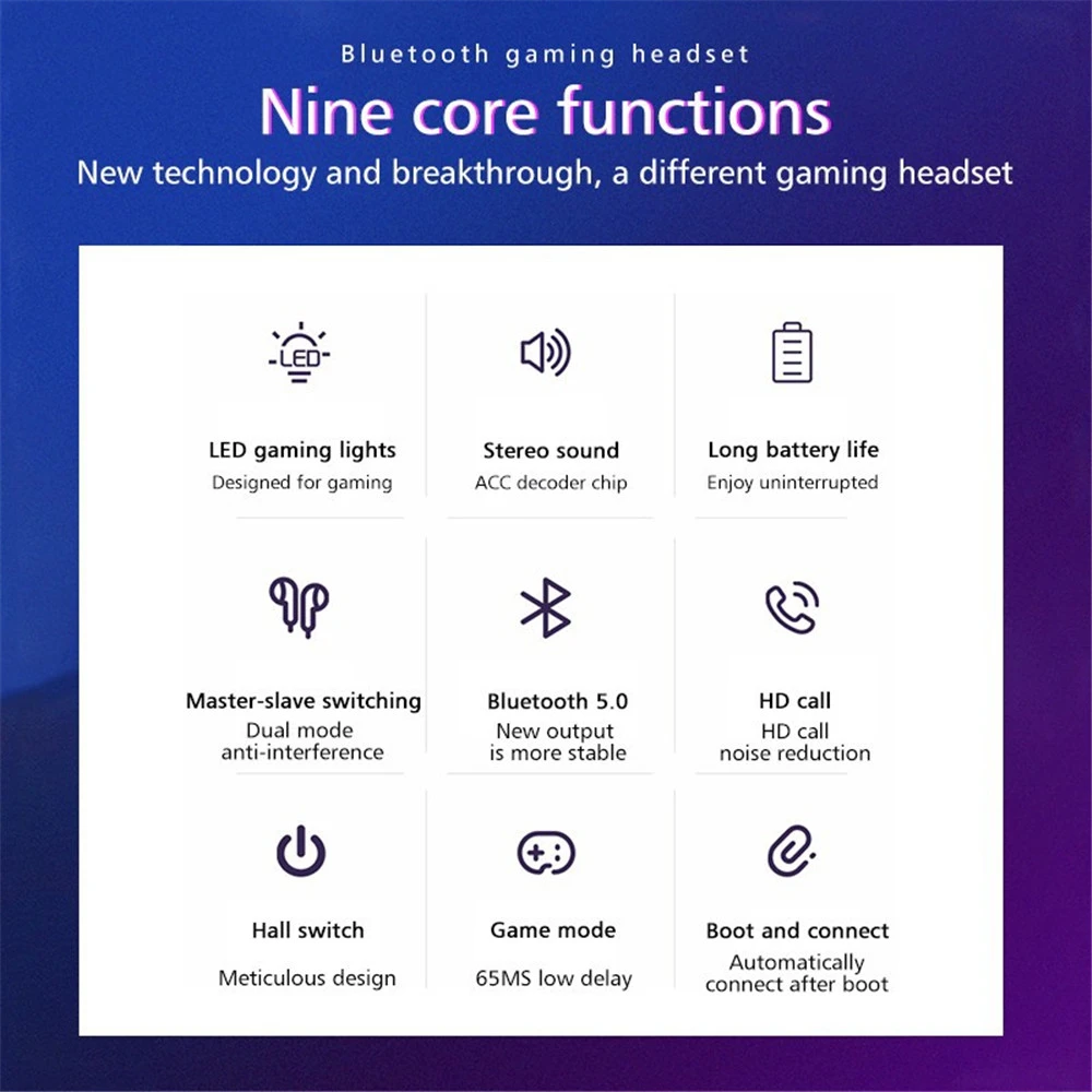 Особенности:1, Bluetooth V5.0, Поддержка большинства устройств bluetooth и низкое энергопотребление2, чехол для зарядки 800 мАч может полностью заряжать 2 наушника примерно в 8 раз, предлагаем более 50 часов3, с водонепроницаемой технологией, больше не нужно беспокоиться о воде и поте4, 8MMS двойной привод, наслаждайтесь 9D сильным глубоким басом и музыкальным звуком5, популярная функция сенсорного управления, поддержка коммутационных песен, телефонных звонков и голосовых вызовов.Списки аксессуаров:2 * Bluetooth наушники1 * чехол для зарядки1 * USB кабель1 * Руководство пользователя