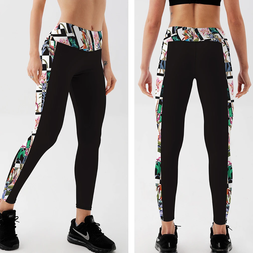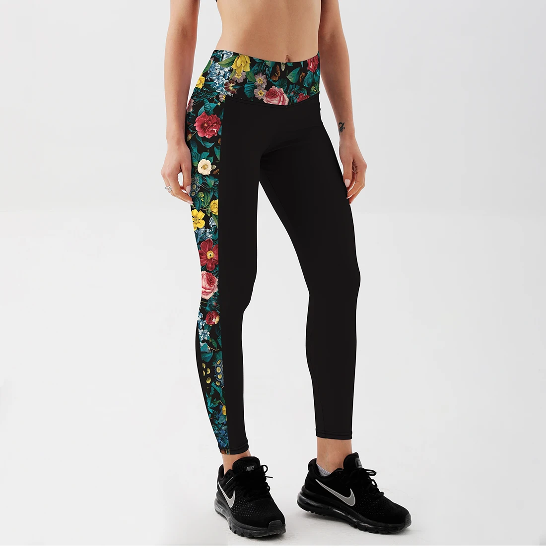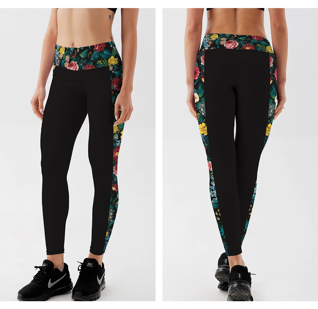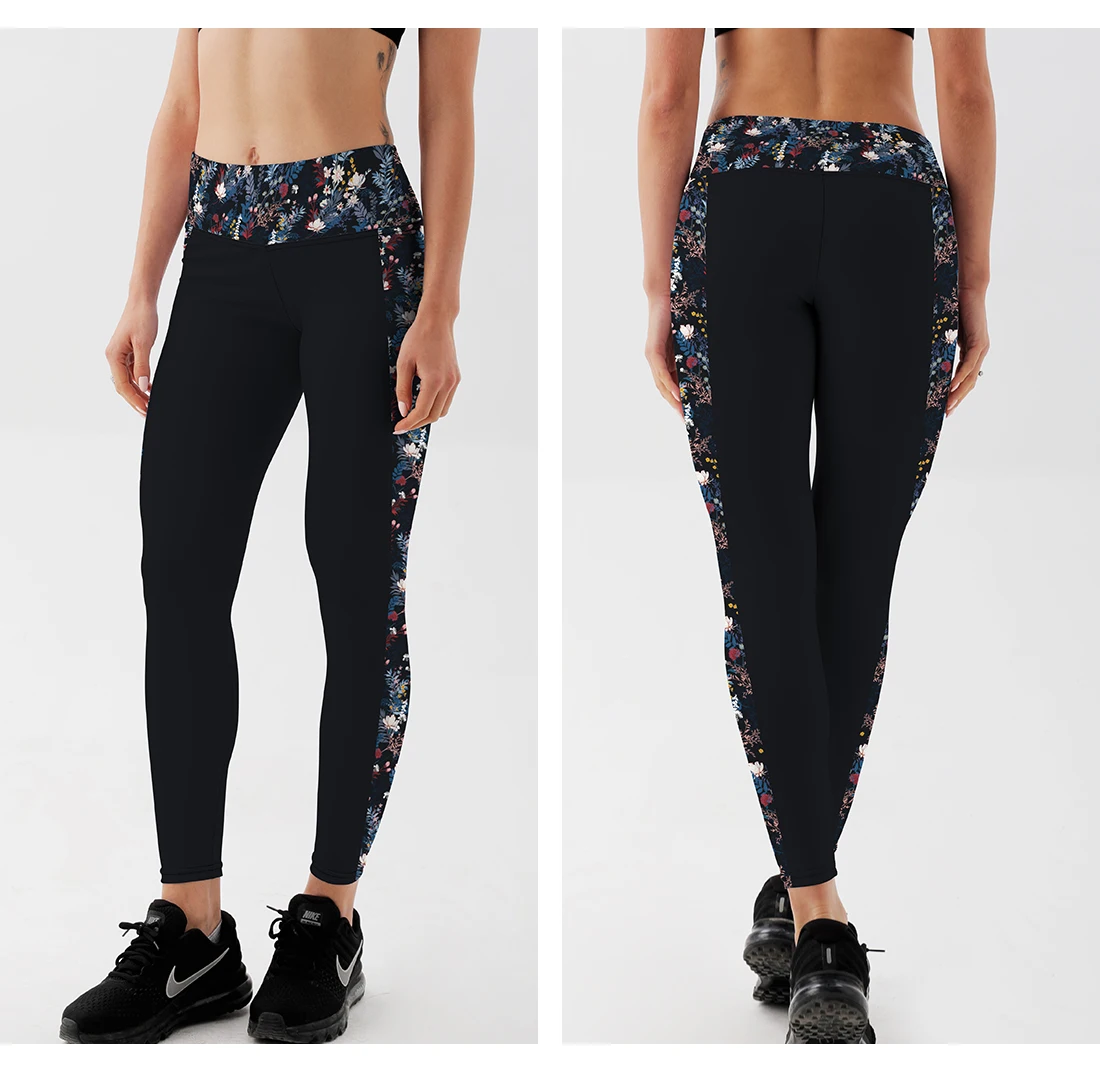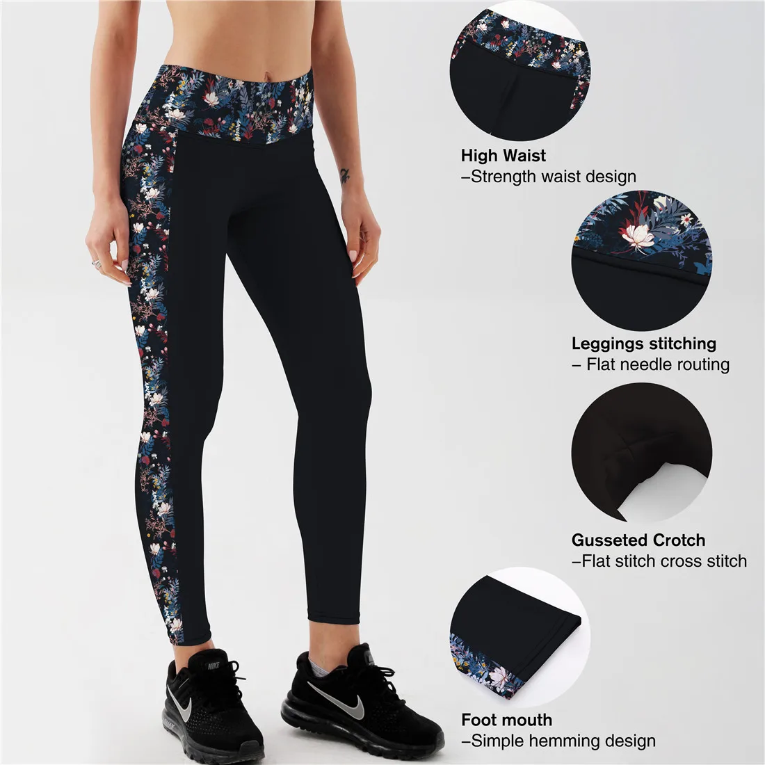 Леггинсы женские, черные, с цветочным принтом, с высокой талией