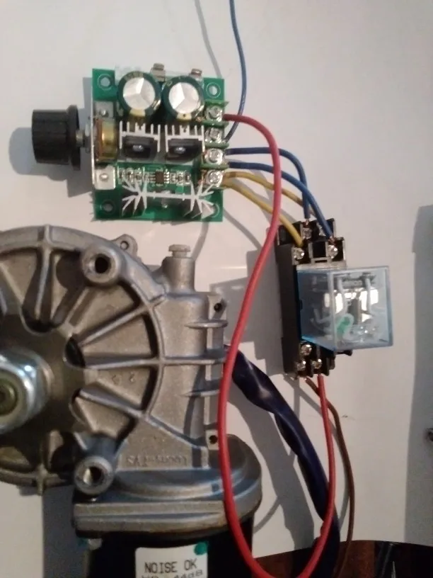 Закрепленная и коническая шестерня для стеклоочистителя с червячным приводом, используются реле и регулятор скорости для переключения направления скорости управления двигателем стеклоочистителя от 0 до 100 процентов Много мощности для устройства, которое я создал. Купил регулятор скорости и реле на AliExpress.