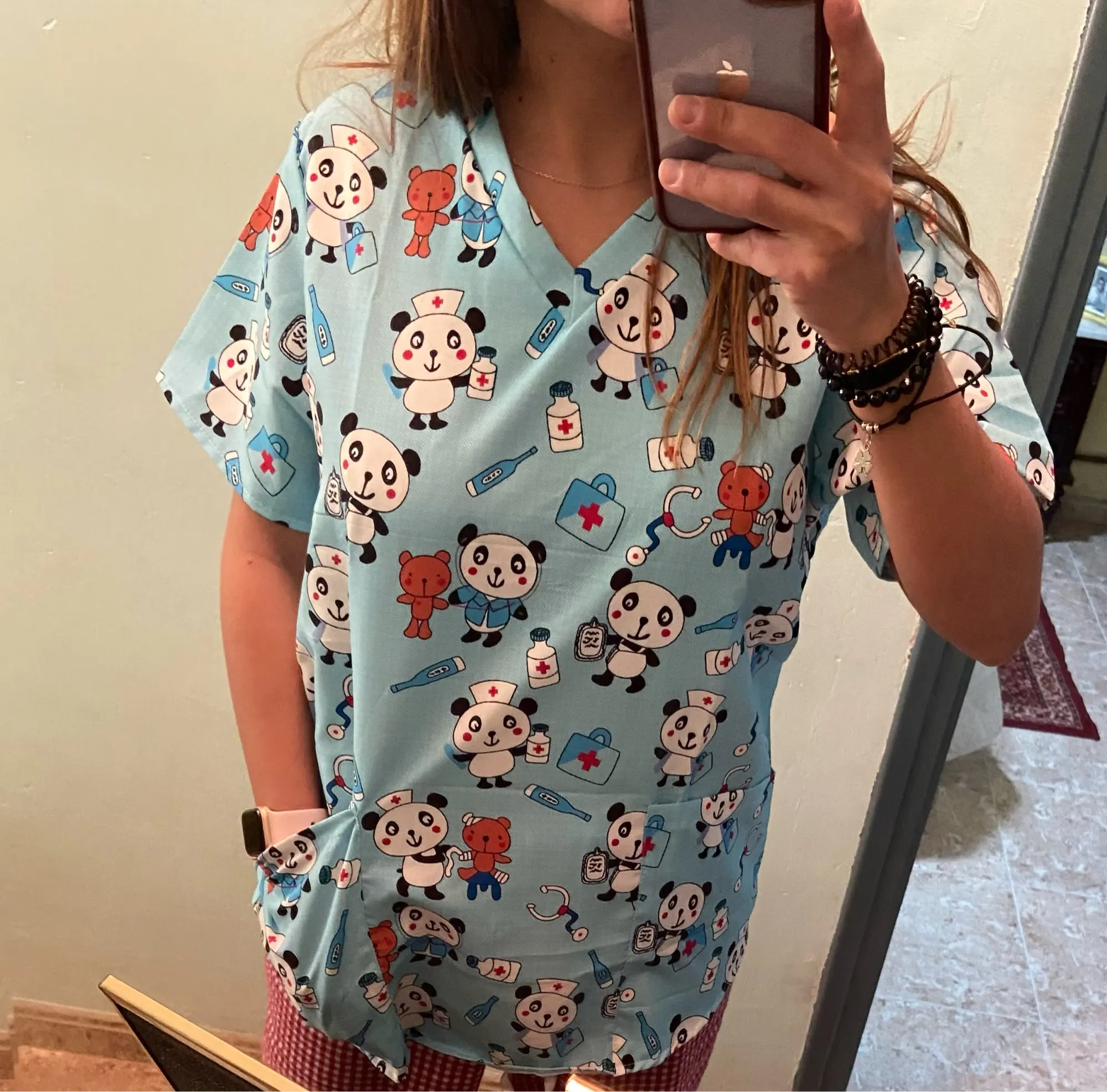 Униформа медсестры с принтом панды, женские топы, пуловер с коротким рукавом, рабочая блузка, летняя мультяшная блузка медсестры, униформа для ухода