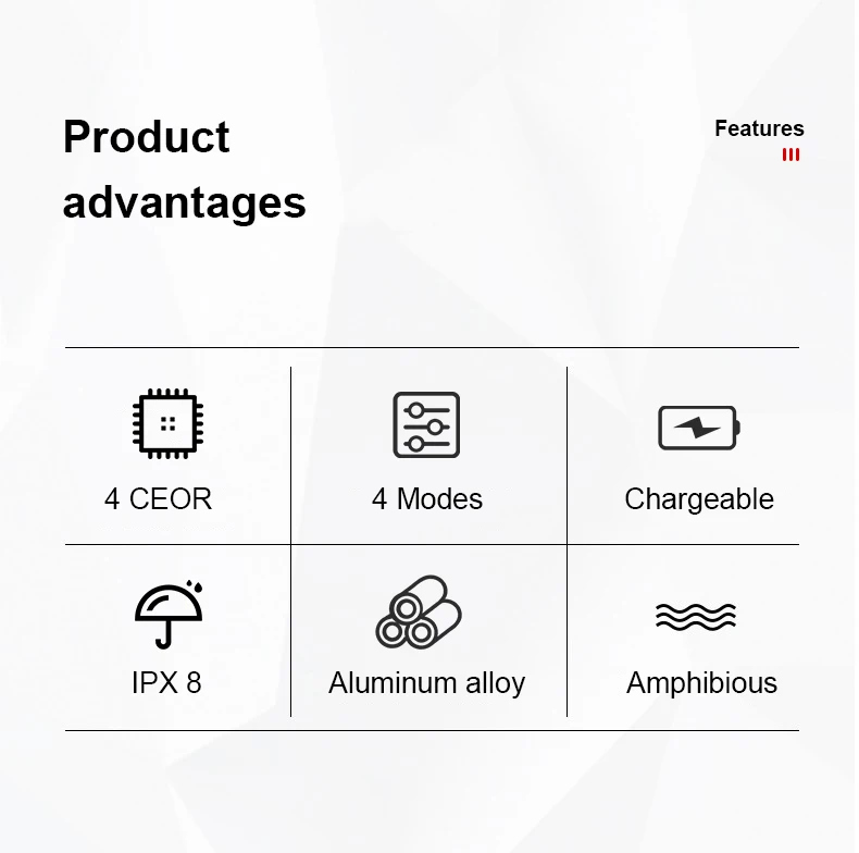 "Особенность"1. Ручной фонарик, яркость сильнее, чем у фары.2. Глубина водонепроницаемости может достигать 100-300 метров, специально разработана для дайверов. Степень водонепроницаемости: IPX83. 4 режима: (сильный, слабый, стробоскоп, долгое нажатие SOS), вы можете переключать требуемый режим в разных условиях.4. Использование авиационного алюминиевого сплава и цельнометаллического корпуса с технологией числового управления, высокая прочность, светильник вес; Не боится падений, не боится давления, долговечность.5. Режим фиксированной фокусировки, более четкий при использовании под водой.6. Он используется для различных видов спорта на открытом воздухе, таких как дайвинг, альпинизм, кемпинг, походы и т. д.