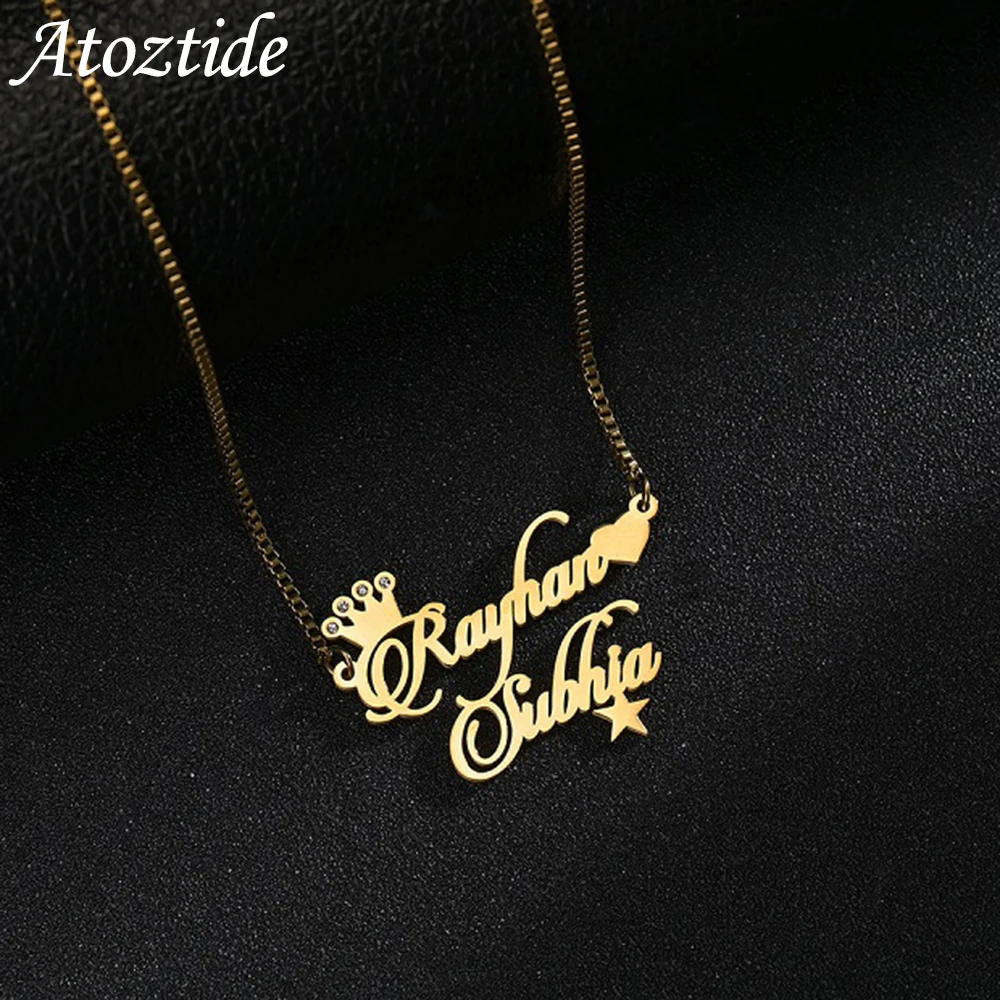 Ожерелье Atoztide с надписью на заказ, цепочка из нержавеющей стали с двумя именами в коробке, Хрустальная корона, звезда, Очаровательная подвеска с именной табличкой для женщин, подарок