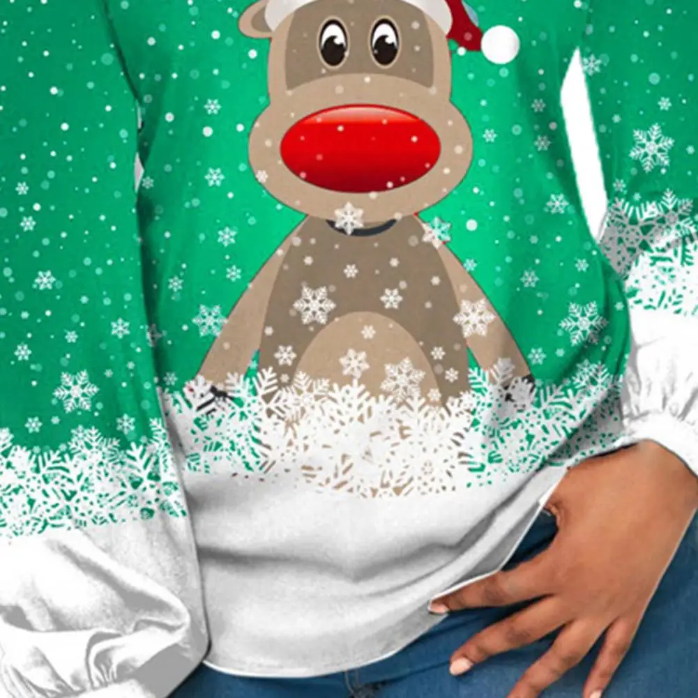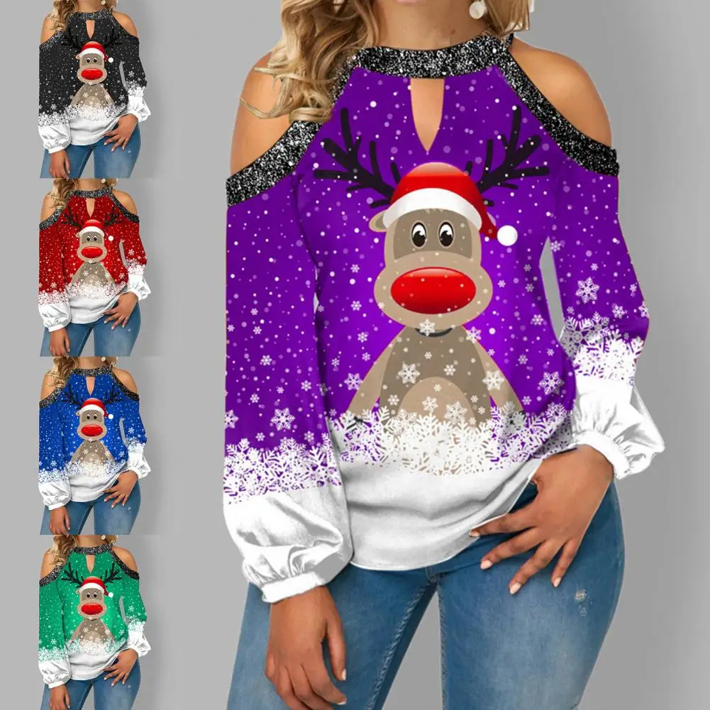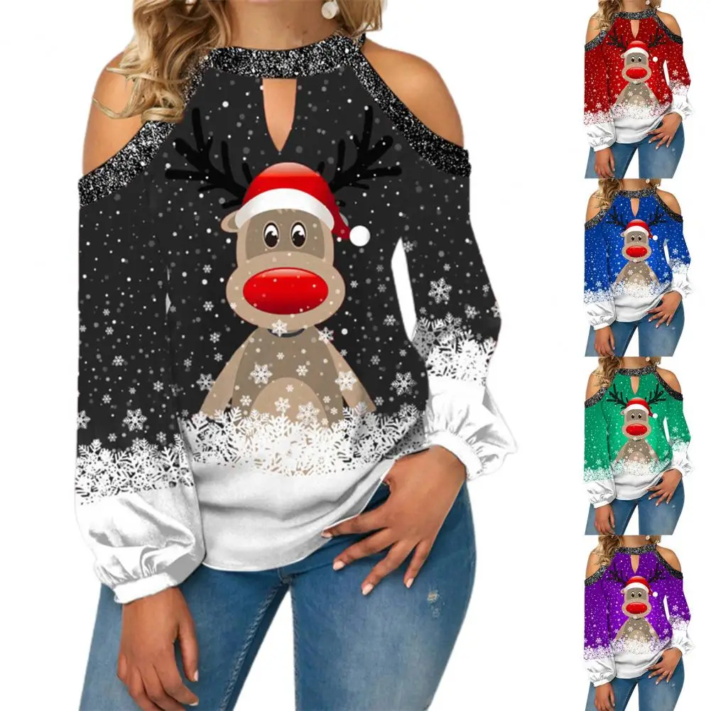 Новинка 2021, женский Принт с рождественским лосем, футболка, повседневный Свободный пуловер с открытыми плечами, топы, модная женская зимняя одежда с длинными рукавами-фонариками