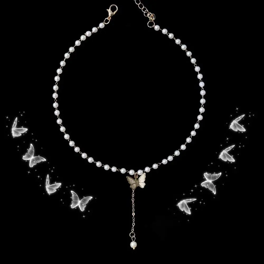 Ожерелье многослойное с жемчугом и бабочкой женское, модное колье-ч...