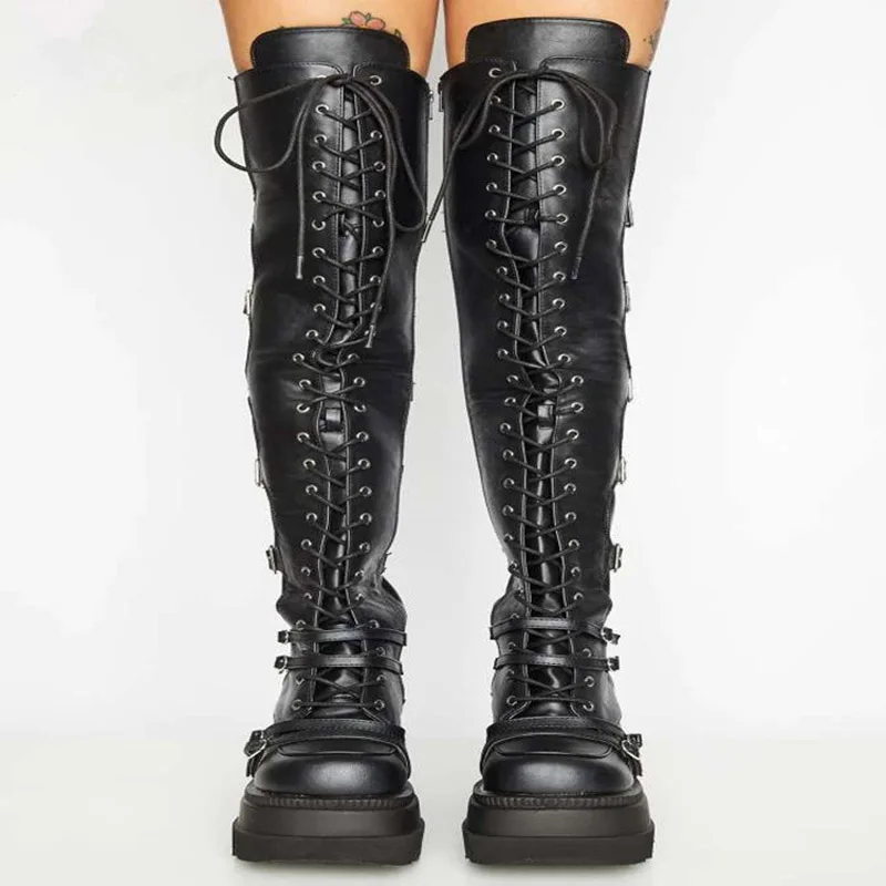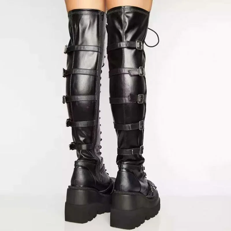 Женские готические сапоги для косплея, высокие сапоги до бедра на танкетке, мотоциклетная обувь, 2021