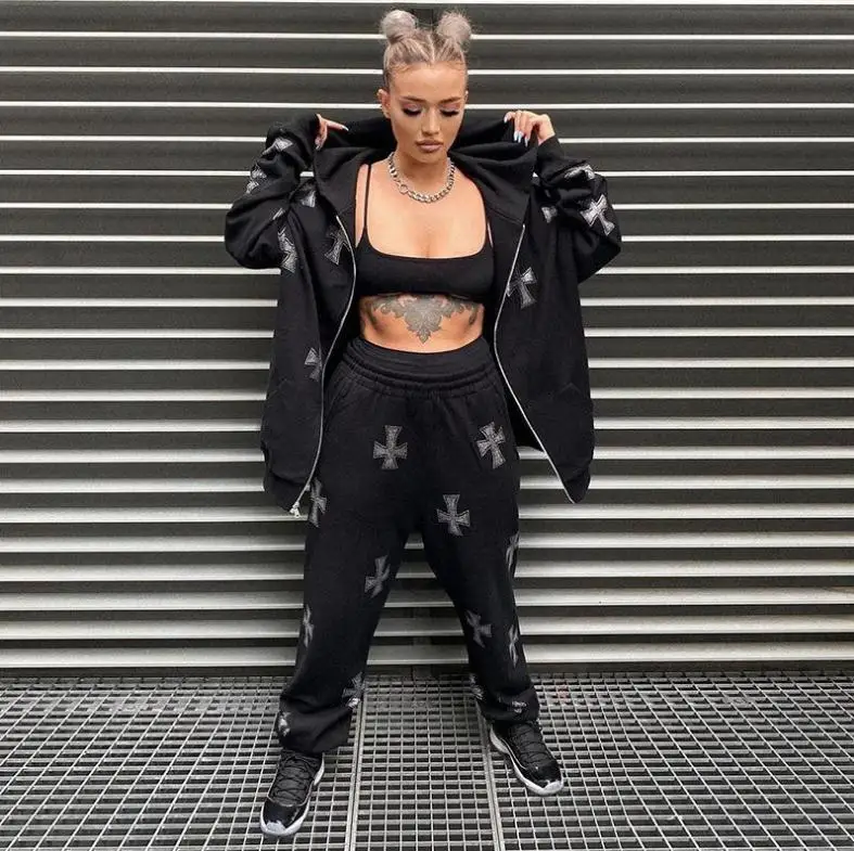 Толстовка Женская на молнии, со штанами оверсайз, стразы, на осень и зиму, готика, Харадзюку