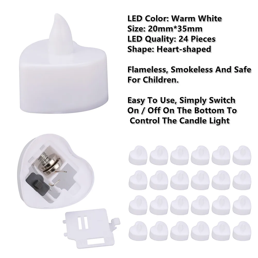 Батарея: в комплектеМатериал: полипропиленовый пластикФорма: в форме сердца dЦвет изделия: молочно-белый, когда светильник выключен.Светодиодный цвет: теплый белыйРазмер: прибл. 20 мм * 35 ммКачество светодиодный: 24 шт.Беспламенный, бездымный и безопасный для детейПростой в использовании, просто включите/выключите на дне, чтобы контролировать светильник свечиПодходит для всех вечеринок или праздников Посылка включает в себя: 24 * светодиодный светильник(По вашему выбору)