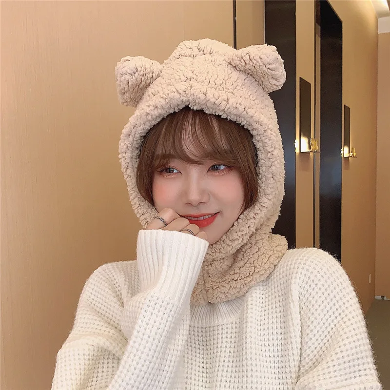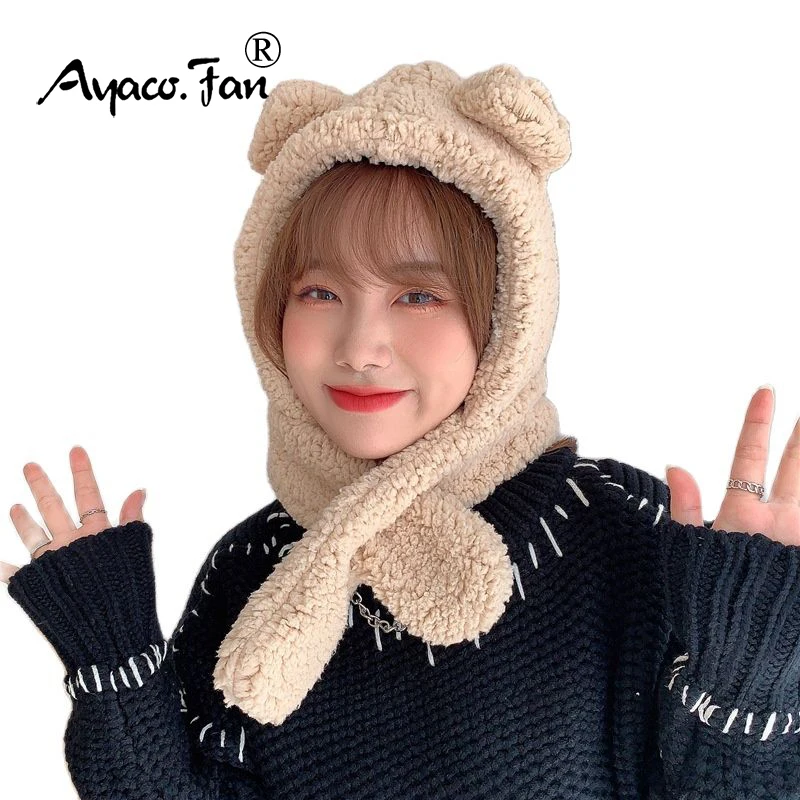 Шапки-бини из хлопка и шерсти, шапки, милый мягкий однотонный шарф, шапка для зимы, женская шапка с медведем для девушек, теплая шапка с защитой шеи и ушками для мужчин
