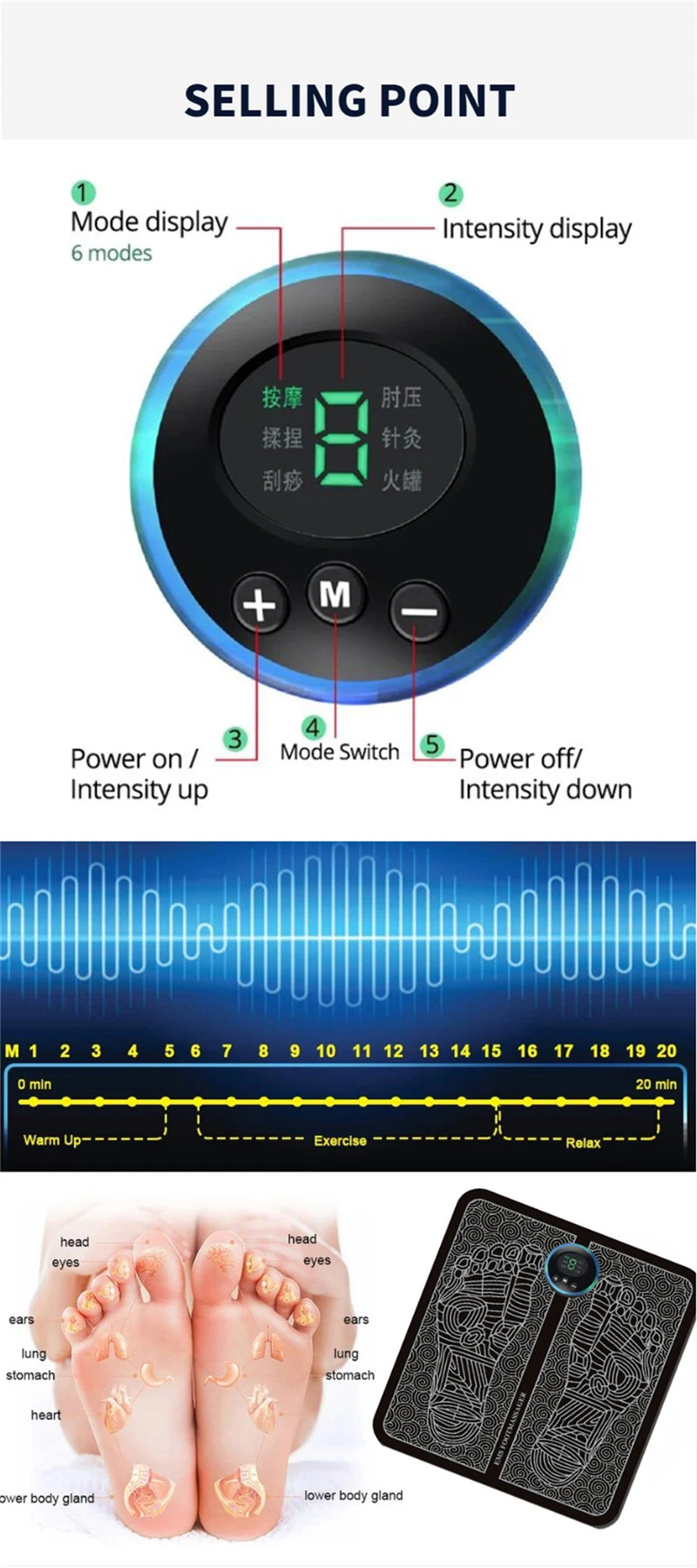 Выберите один из 6 режимов. * Выберите 6 режимов, прост в эксплуатации. * Если вы забудете выключить через 12 минут бездействия, он автоматически отключится. * Интенсивность стимуляции определяется 9 уровнями (интенсивность 1-9) один раз в день. Если он не подключен к вашей стопе, он автоматически отключается через 15 секунд.