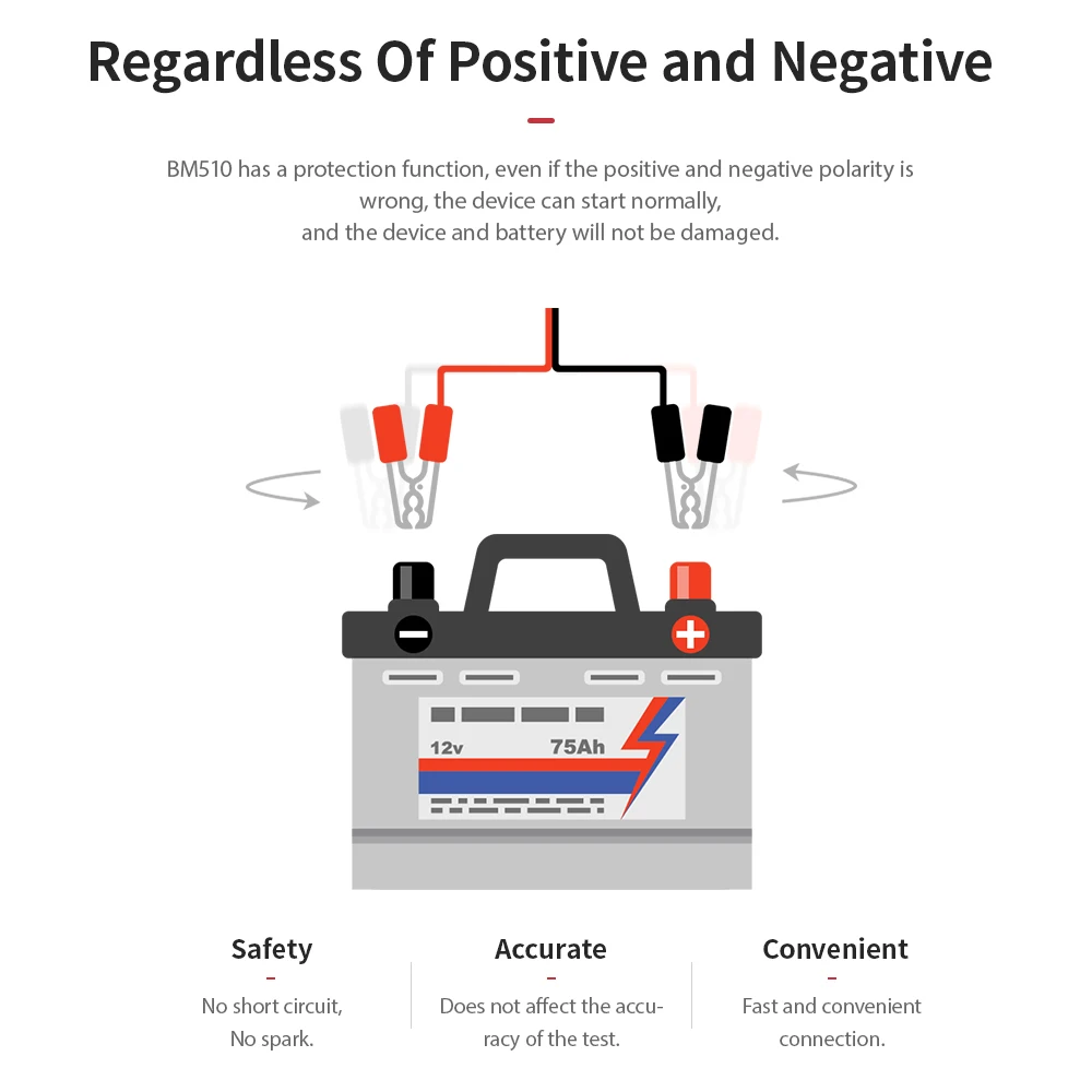 Независимо от положительных и отрицательных тестов: BM510 имеет функцию защиты, даже если положительная и отрицательная полярность неправильная, устройство может нормально работать, и устройство и аккумулятор не будут повреждены.