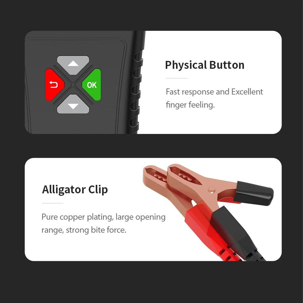 Испытание батареи:Дисплей SOH (состояние здоровья), SOC (состояние заряда), напряжение, ток, рейтинг и результаты считываемого анализа на ЖК-экране подсветки и смарт-3 светодиодный индикатор;