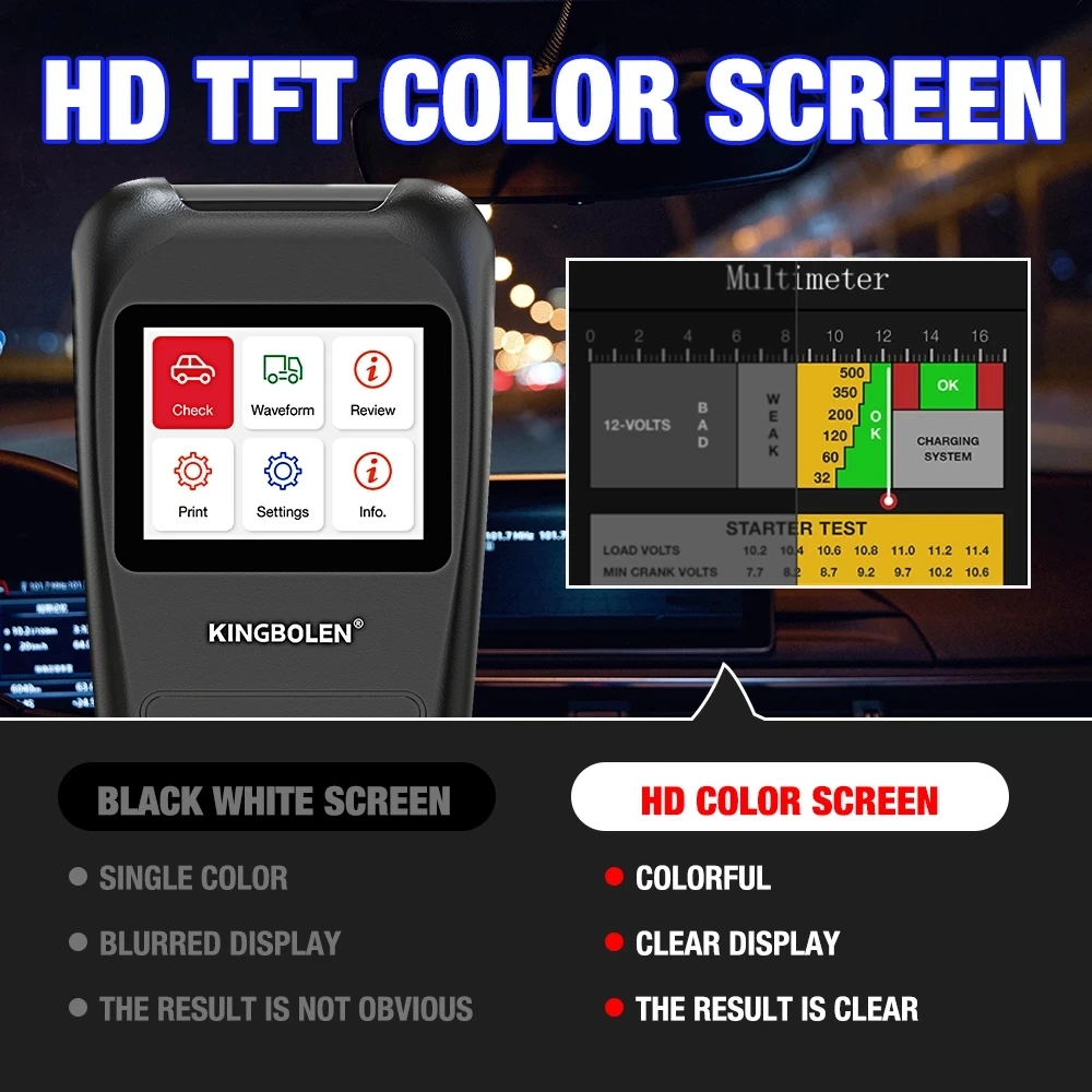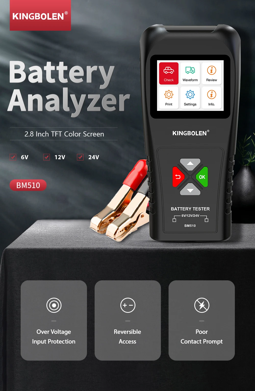 KINGBOLEN BM510, отличное устройство, которое позволяет вам легко и просто проверять состояние батареи, оснащено основными функциями, чтобы дать вам всесторонний анализ срока службы батареи: