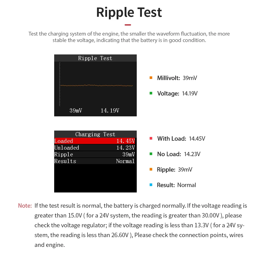 Тест пульсации: Проверьте систему зарядки двигателя. Чем меньше колебания формы волны, тем стабильнее напряжение, что указывает на то, что аккумулятор находится в хорошем состоянии.