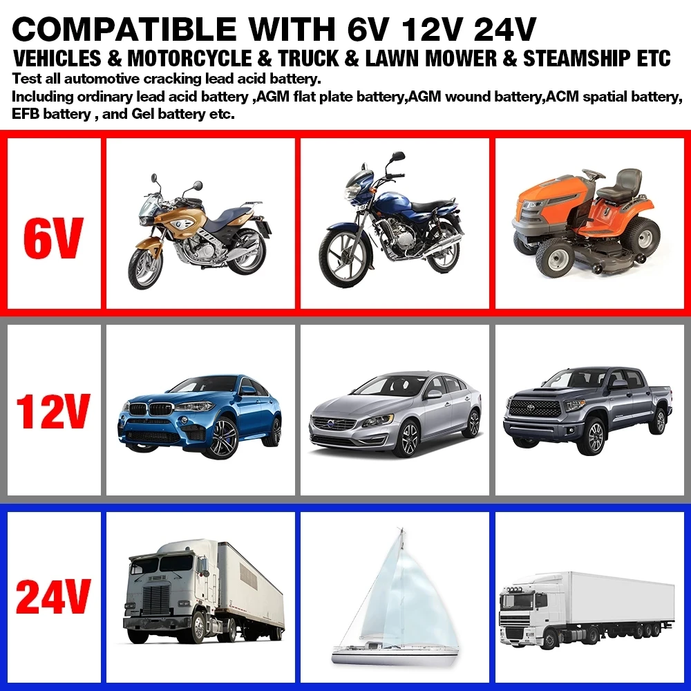 Он может протестировать 6 в/12 В/24 В три разных типа батарей, подходит для различных общих моделей и оборудования, одна машина для разных целей.